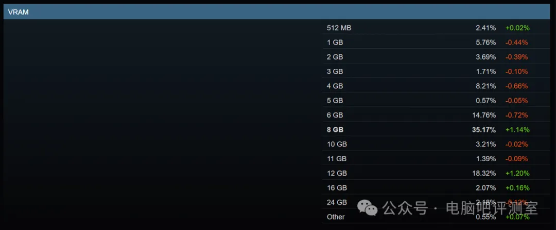STEAM平台最主流显存容量为8GB,这倒也不奇怪,毕竟最近10年显存容量为8GB的显卡实在太多了,英伟达前几代的中高端以及AMD的主流和中低端大部分都配备了8GB显存。512MB/1GB显存产品居然也有近8%的占比,估计还包含了大量核芯显卡的数据。