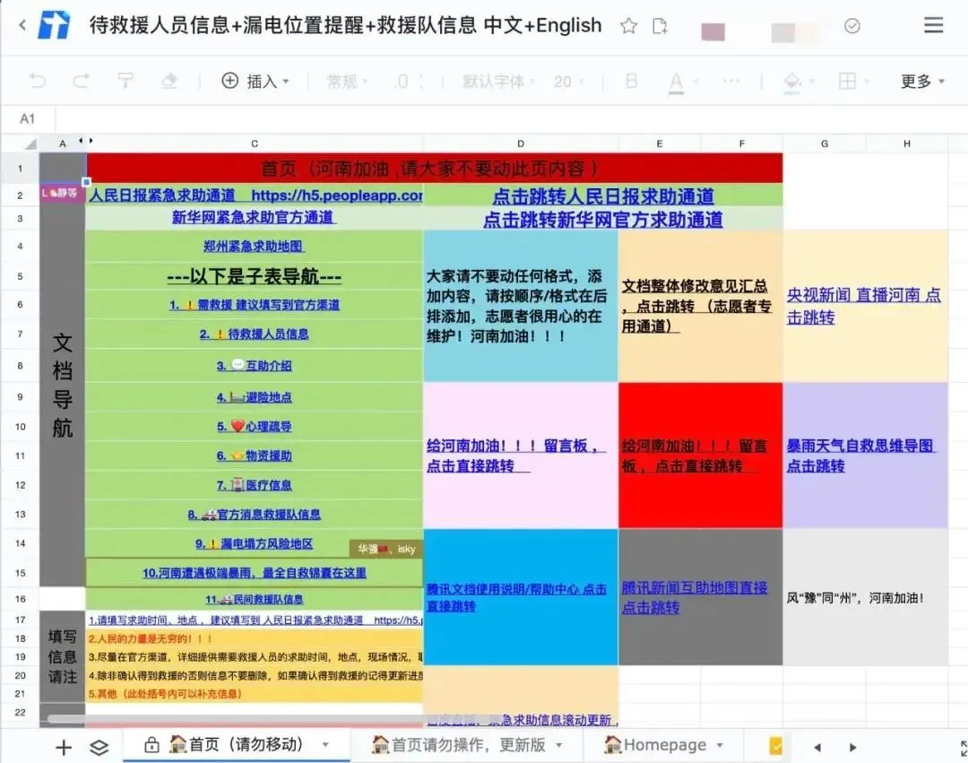 还有一个郑州的朋友特意躲到最下面写了一段因为工作而丧气的话。网友们自发用粉色的“加油”把他团团围住。之后表格中出现了第三个sheet——“漏电风险地区”,提醒大家避免出入会漏电风险的场所。“官方救援队信息”“民间救援队信息”也被加入表格中,医生们自发组织起了线上问诊群……“救援信息收集的在线表格”变身为“多用途”的民间抗洪资源对接平台。