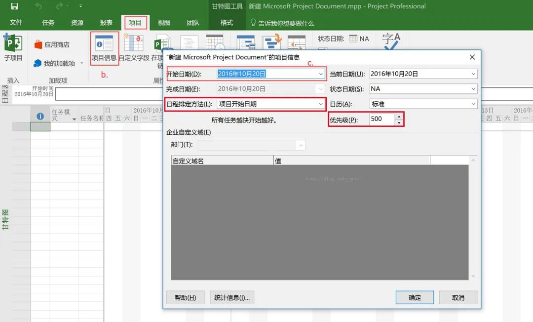 如下图所示,在菜单中找到【项目】,并在其下拉菜单中点击【项目信息】,便会弹出窗口,在该窗口中设置对应的【开始时间】,【日程排定方法】和【优先级】,那么一个项目就这么创建好了。