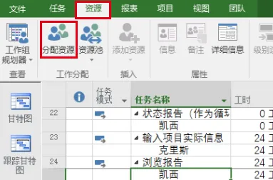 在这一环中,需要录入的信息主要以任务,工期,人员清单,当完成录入后就需要对工作进行分配。如下图所示,点击【资源】下拉菜单中的【分配资源】,根据资源名称,按照任务的优先级,对应设置好优先级别即可完成资源分配。当然,这里也可以在名称列中直接选择。