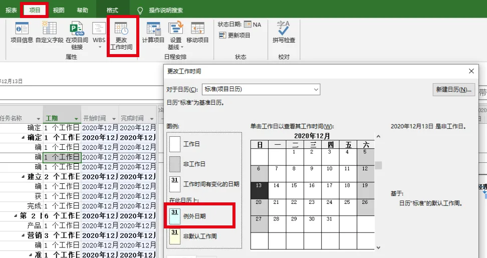 这个设置动作所在的窗口与创建项目日历是同一个窗口,如下图所示,我们需要再次选择菜单中【项目】的下拉菜单【更改工作时间】,在弹出窗口中选择【例外日期】并添加诸如请假的相对应事情,并设置好对应的开始和完成时间。