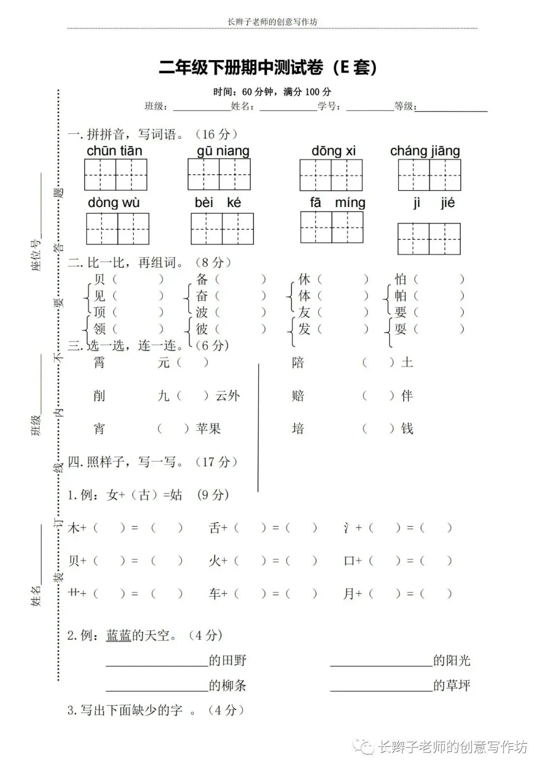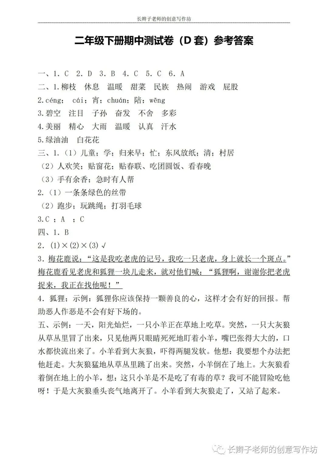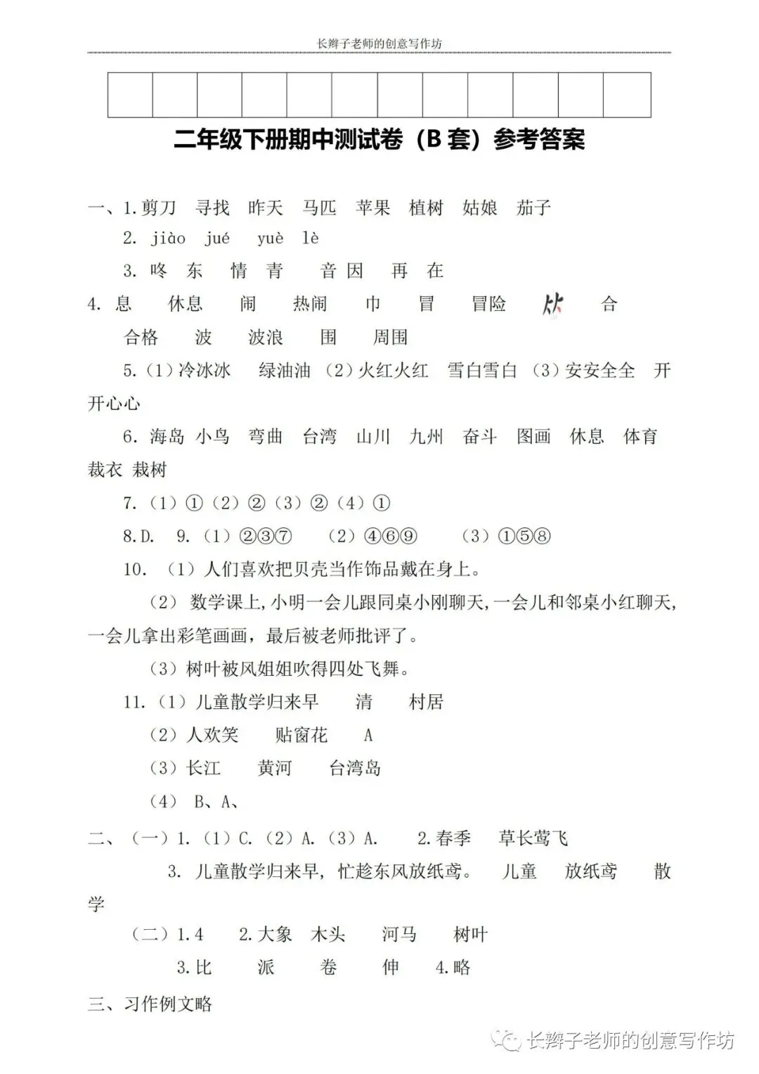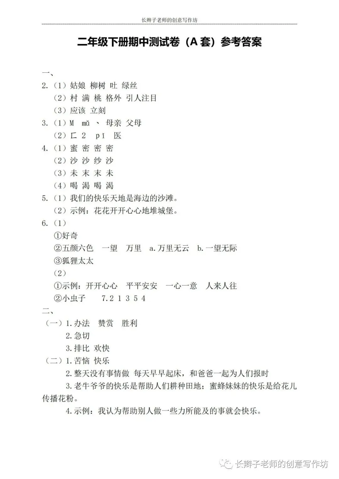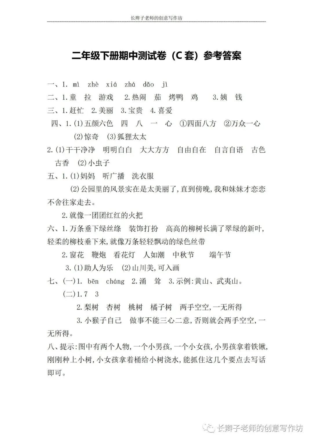 若想获取试卷,关注微信公众号“长辫子老师的创意写作坊”,在首页对话框写——二下期中练习卷5套,即可获取提取链接和密码。也可以直接扫描(或长按)下图二维码,直接获取。