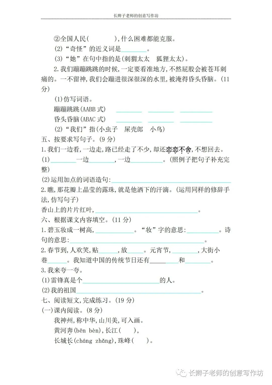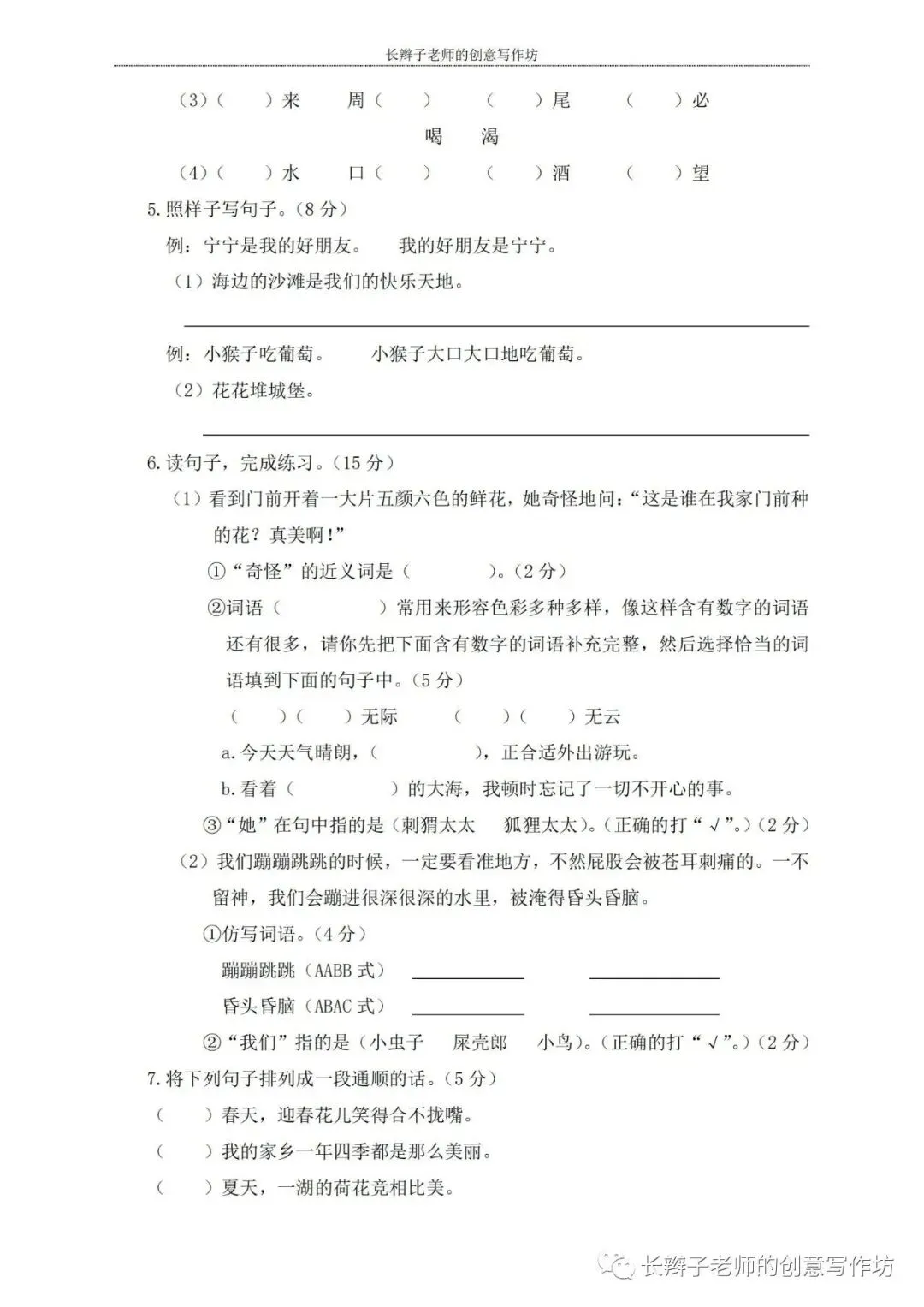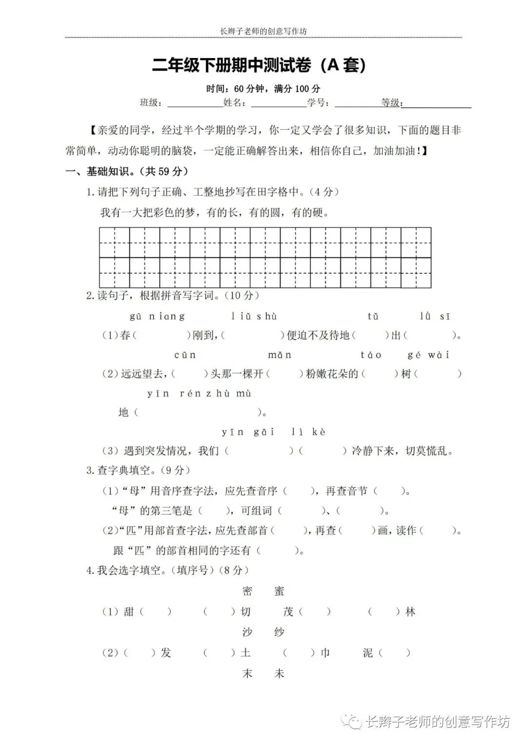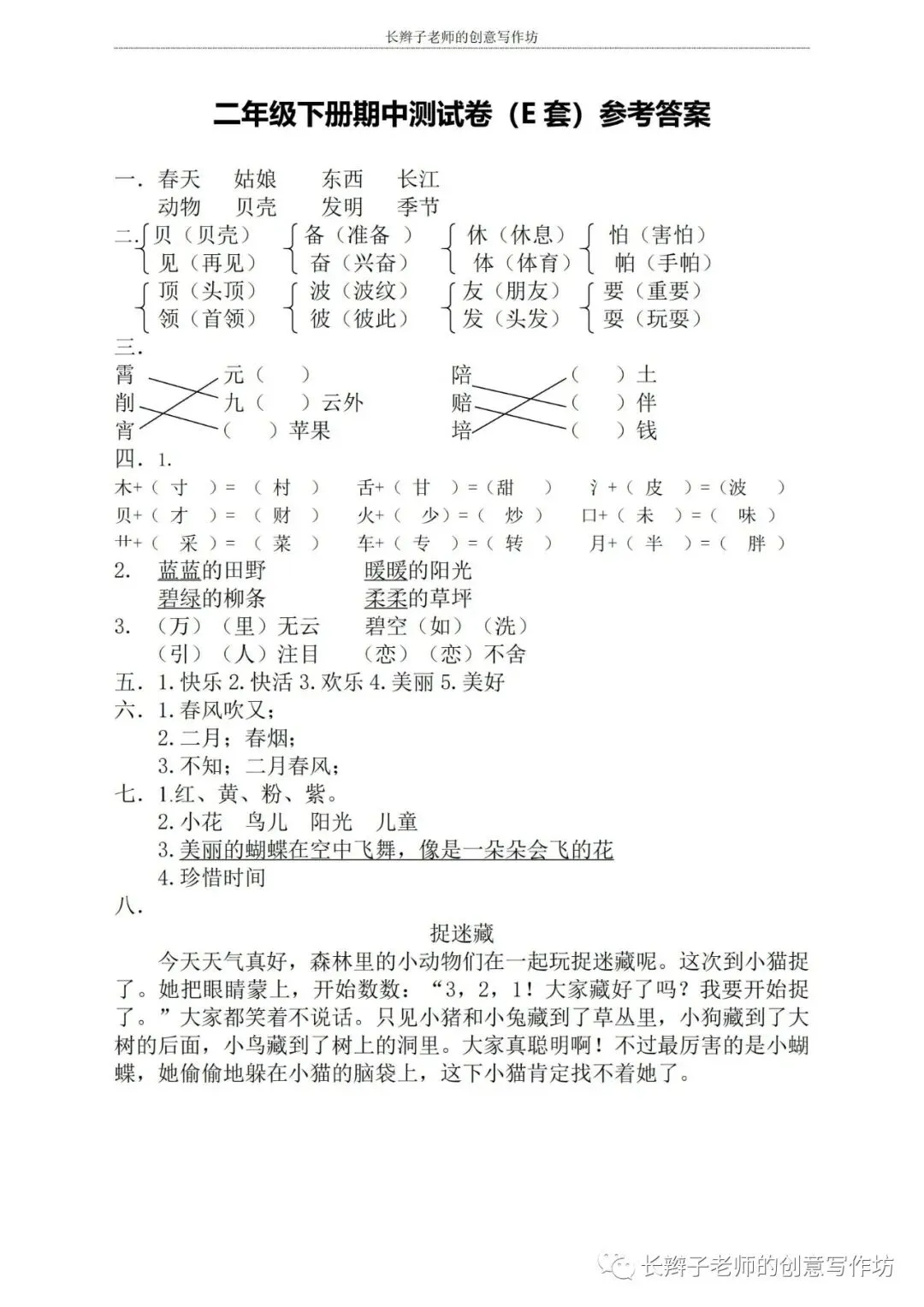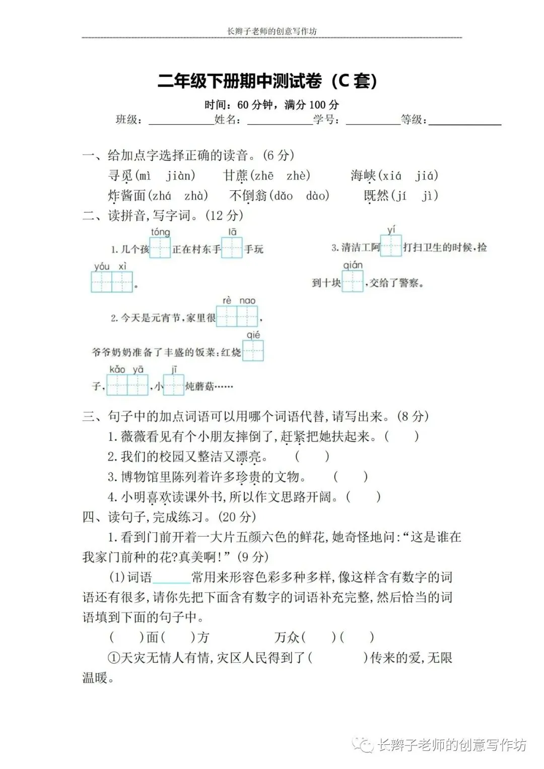 若想获取试卷,关注微信公众号“长辫子老师的创意写作坊”,在首页对话框写——二下期中练习卷5套,即可获取提取链接和密码。也可以直接扫描(或长按)下图二维码,直接获取。