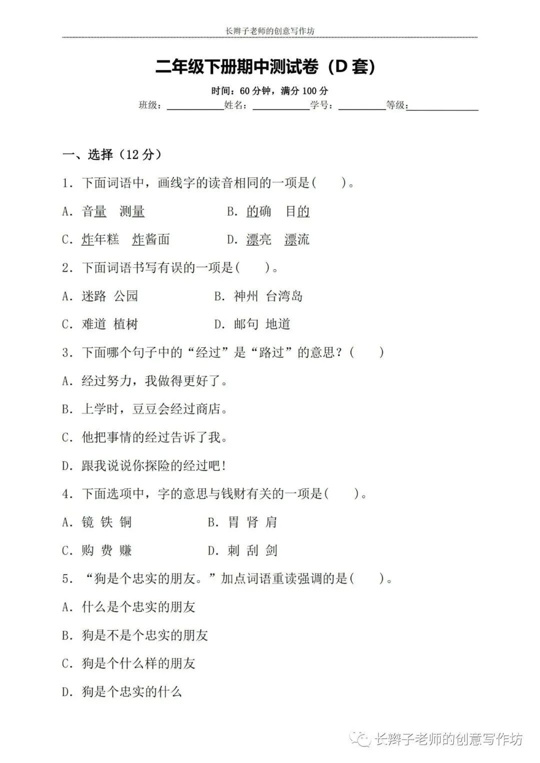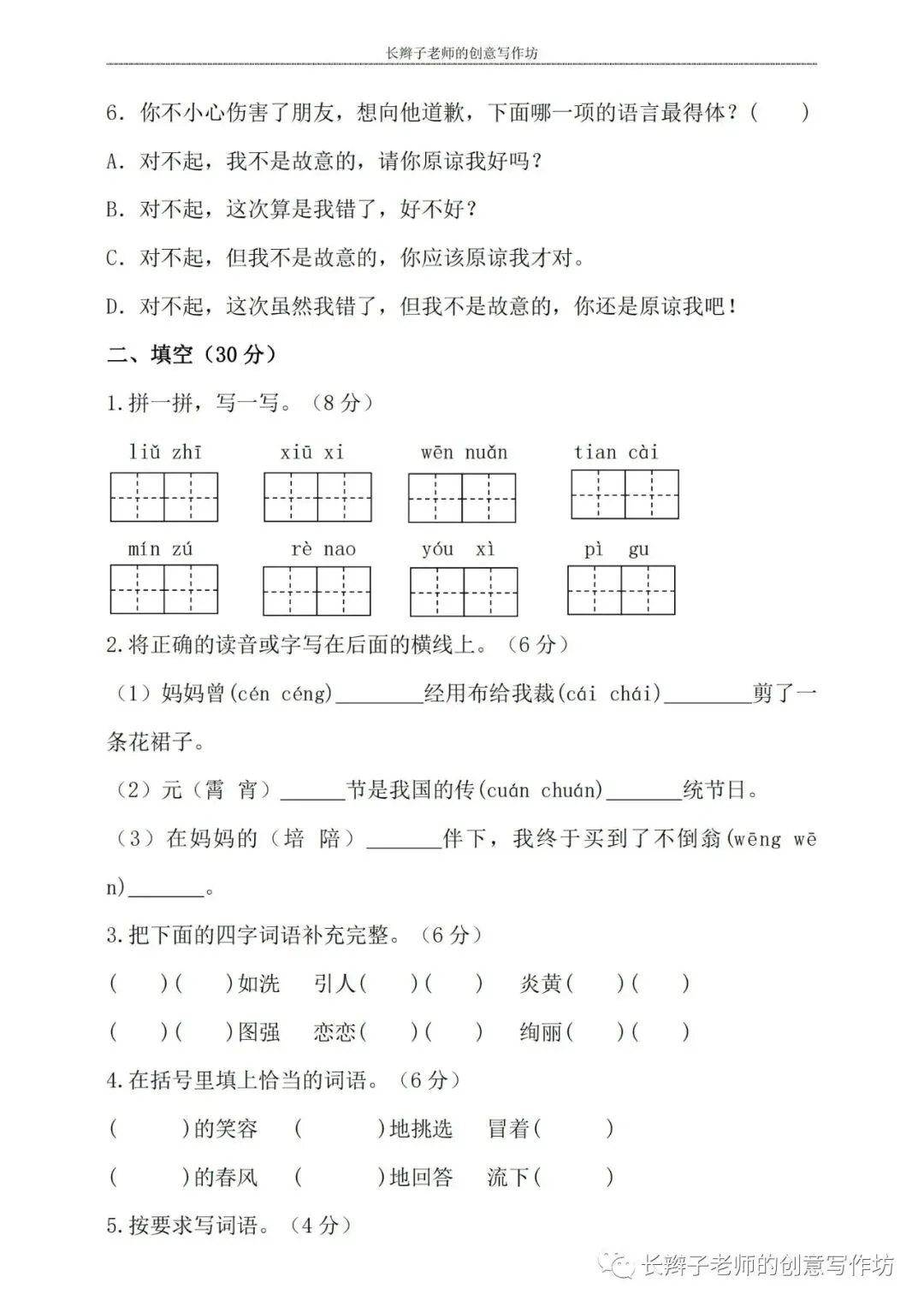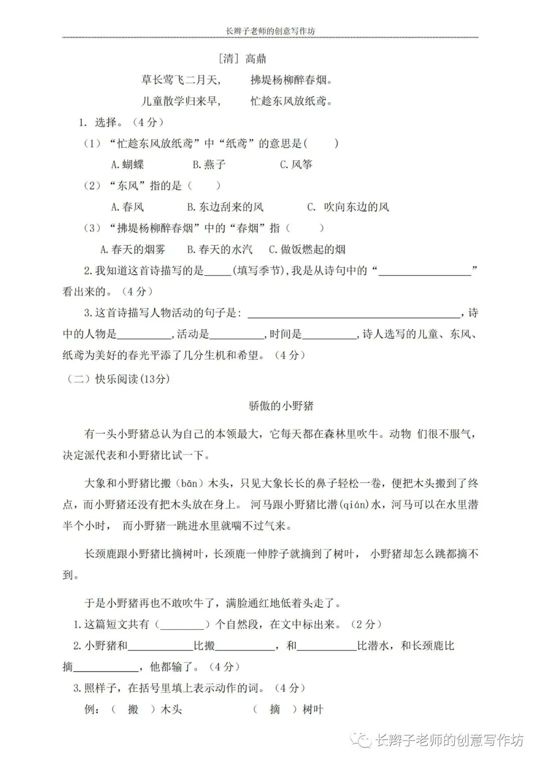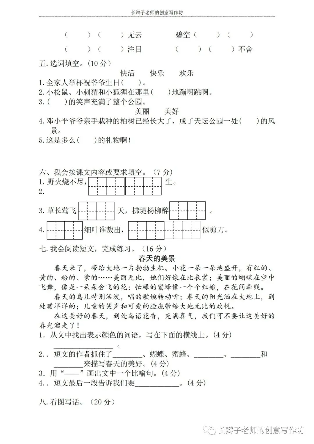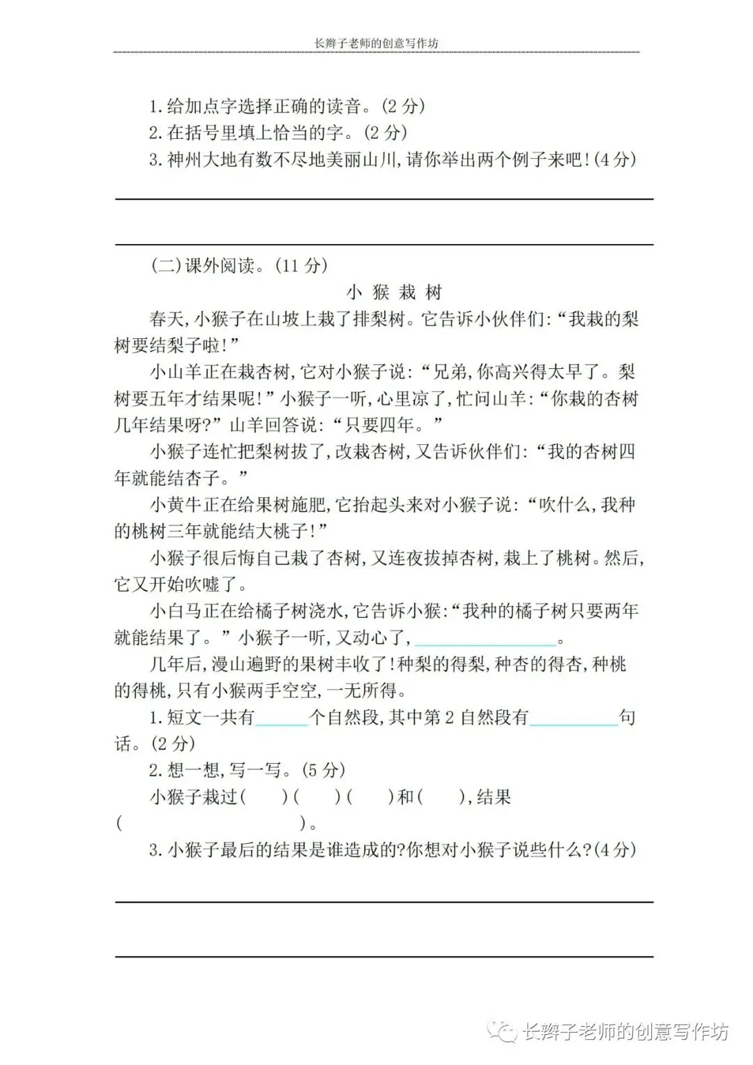 若想获取试卷,关注微信公众号“长辫子老师的创意写作坊”,在首页对话框写——二下期中练习卷5套,即可获取提取链接和密码。也可以直接扫描(或长按)下图二维码,直接获取。