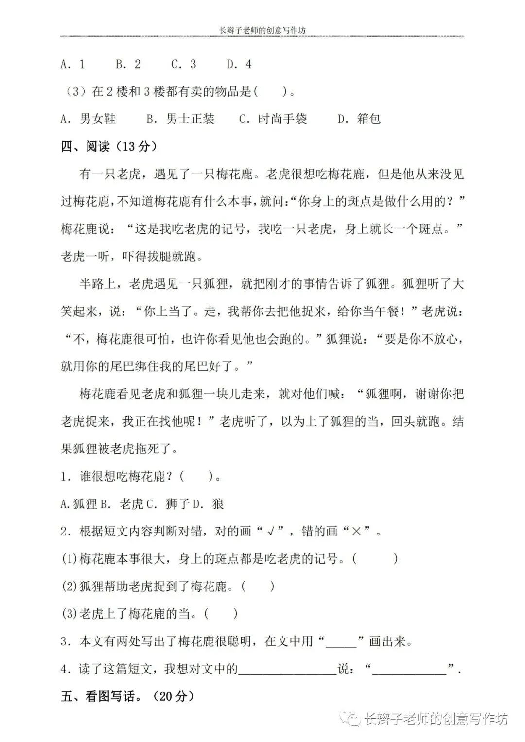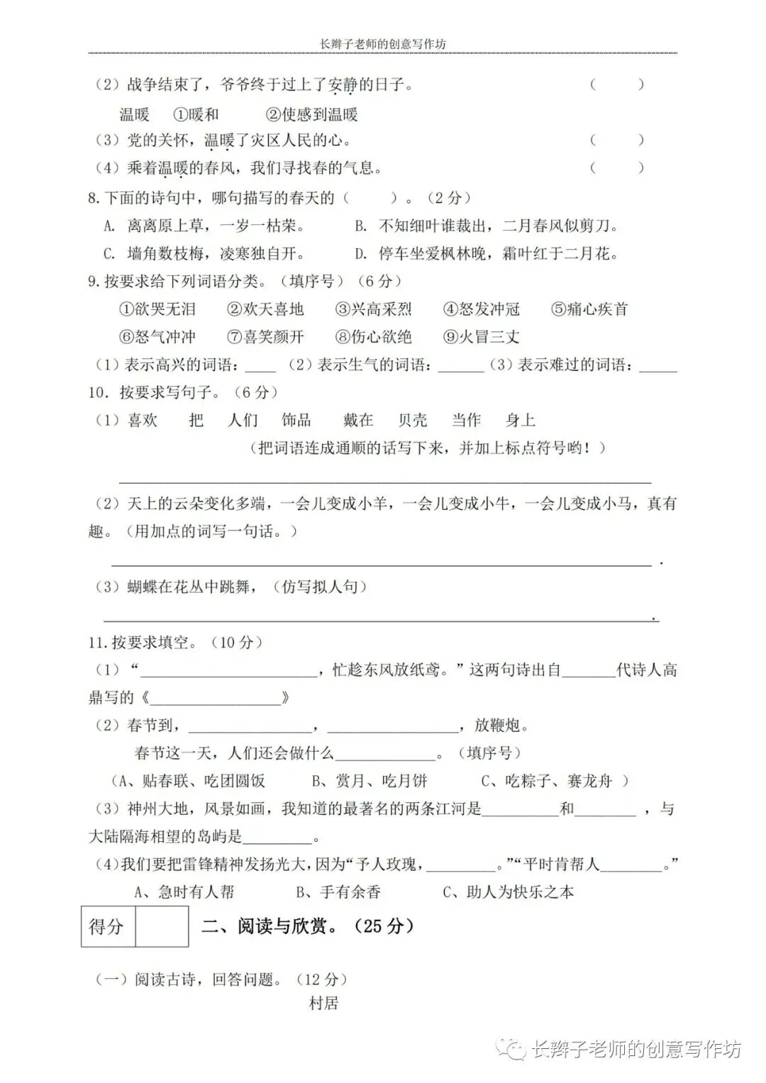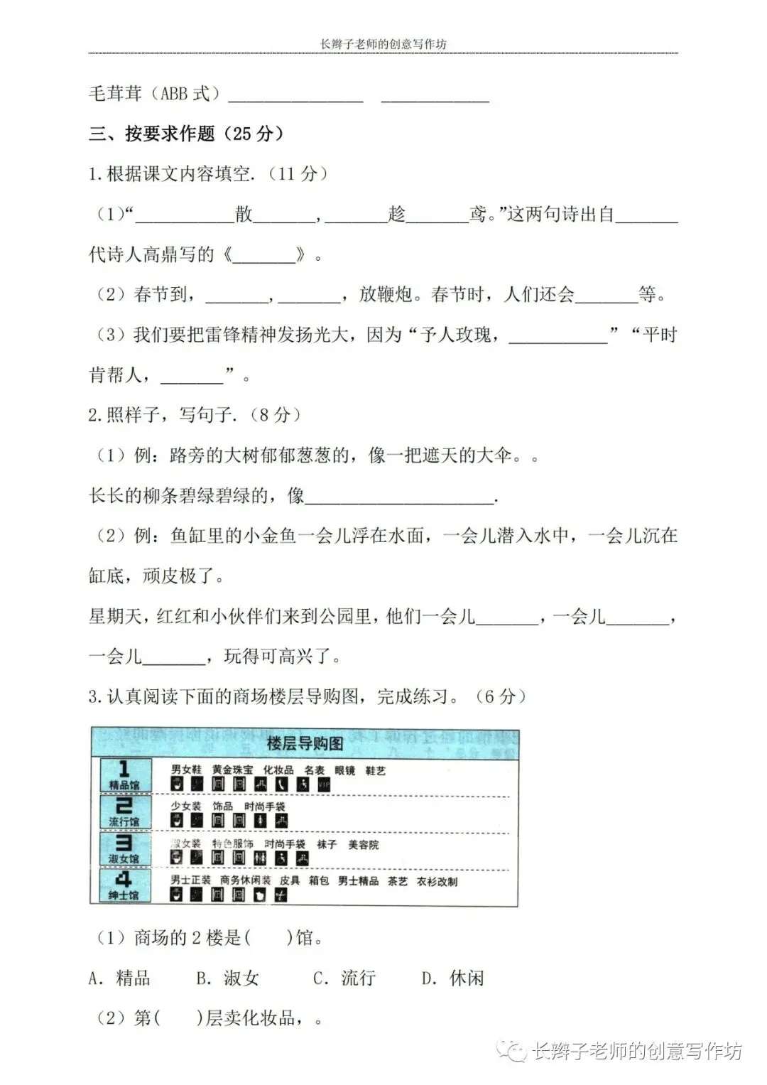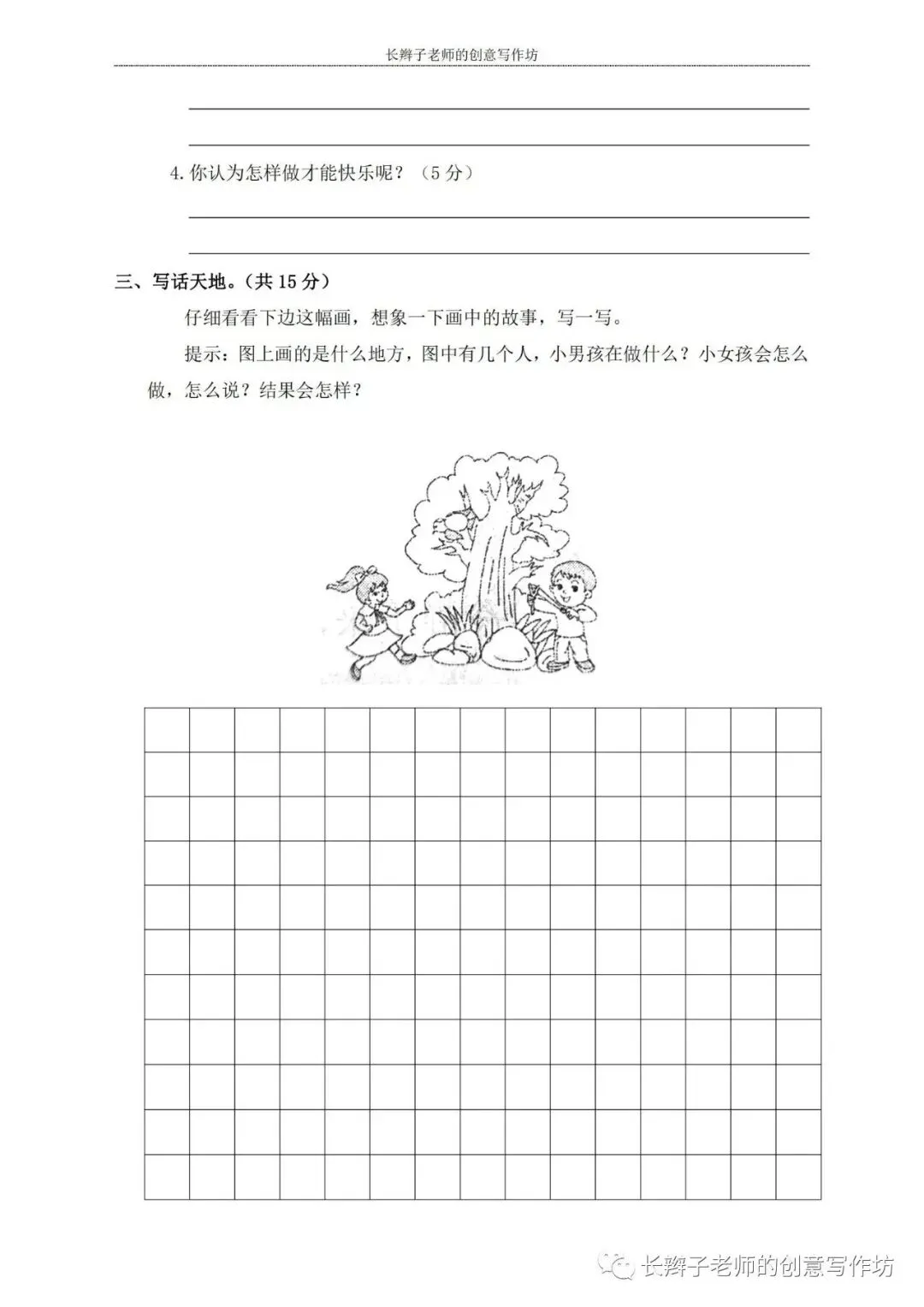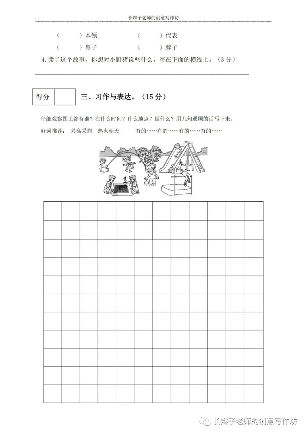 若想获取试卷,关注微信公众号“长辫子老师的创意写作坊”,在首页对话框写——二下期中练习卷5套,即可获取提取链接和密码。也可以直接扫描(或长按)下图二维码,直接获取。