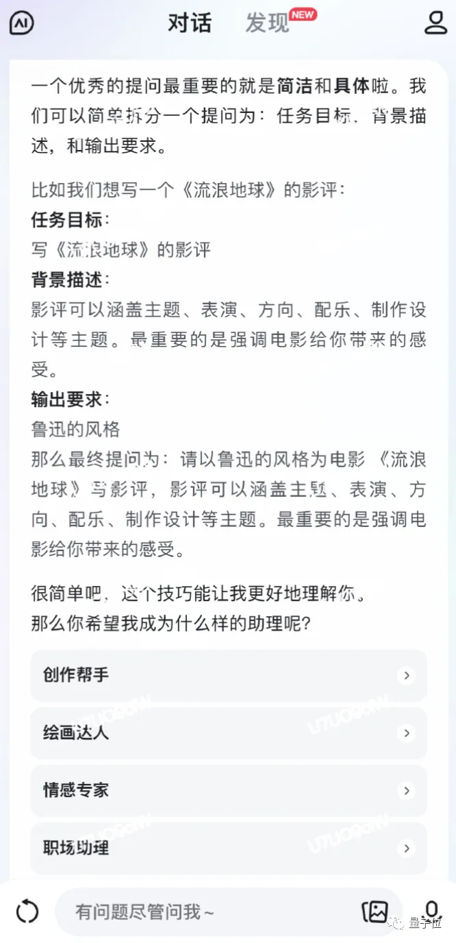如果选择后者,它会一步步列举一些玩法示例,比如写影评、写朋友圈文案什么的。
