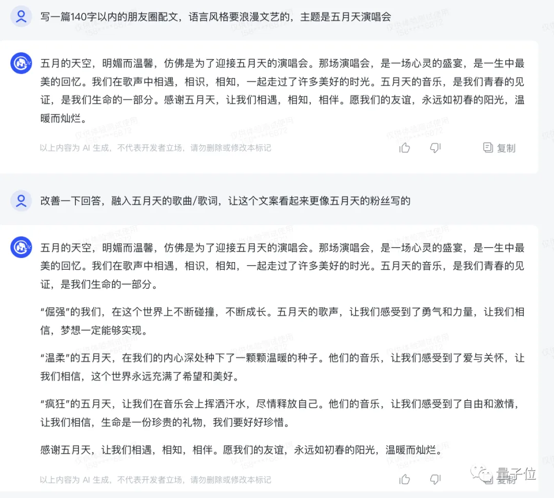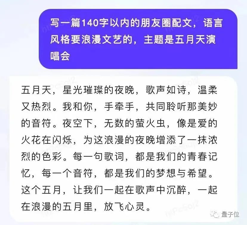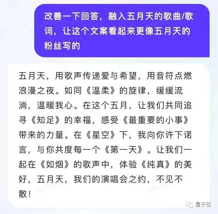 结果是它一开始还不知道五月天是个组合,经过提醒后给出了一段散文。
