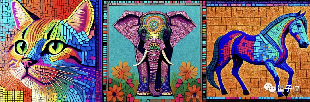 其它玩法生成的效果图像如下,例如“马赛克图案”下的猫、大象和马: