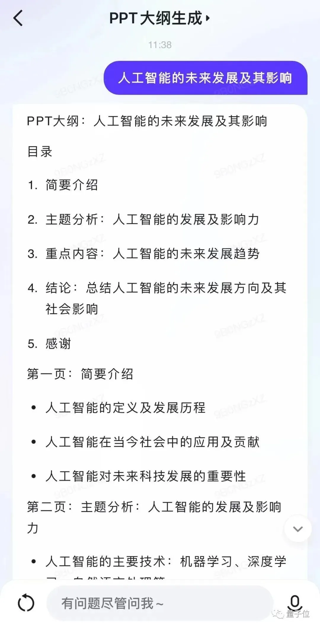 然后文心一言便“唰唰”地生成5页PPT大纲: