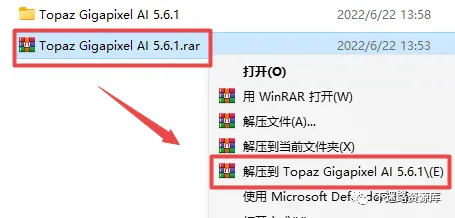 1.选中下载的压缩包,然后鼠标右键选择解压到”Topaz Gigapixel AI 5.6.1″(没有解压选项点这里)
