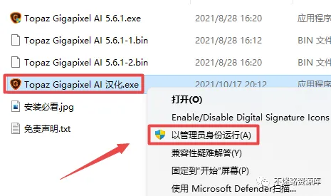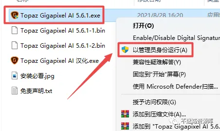 2.打开刚刚解压的文件夹,鼠标右键点击“Topaz Gigapixel AI 5.6.1.exe”选择“以管理员身份运行”