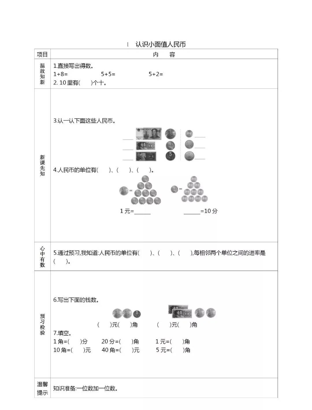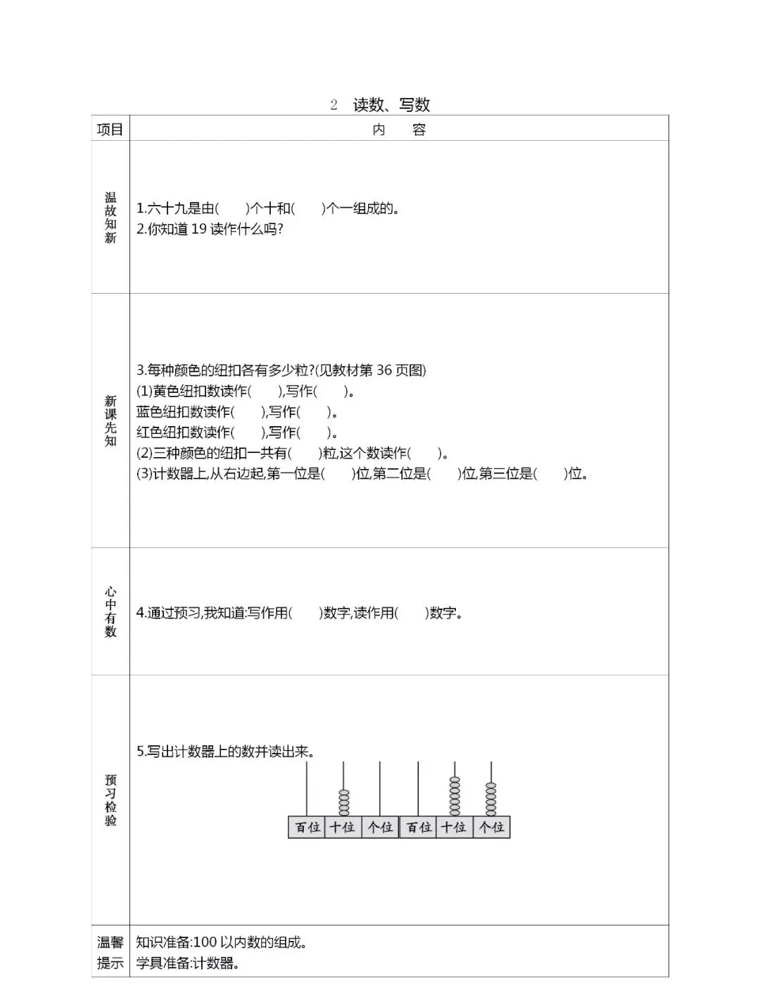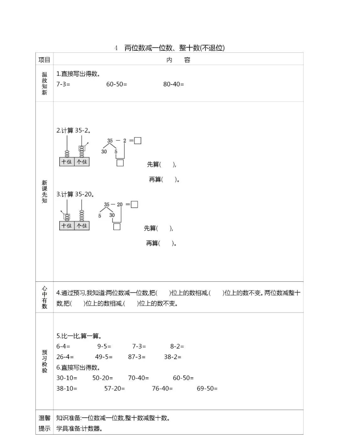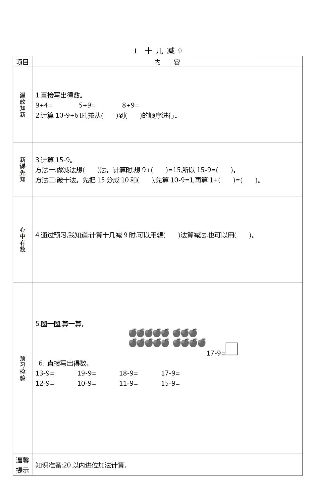 人教版一年级数学(下册)课前预习单,可打印!