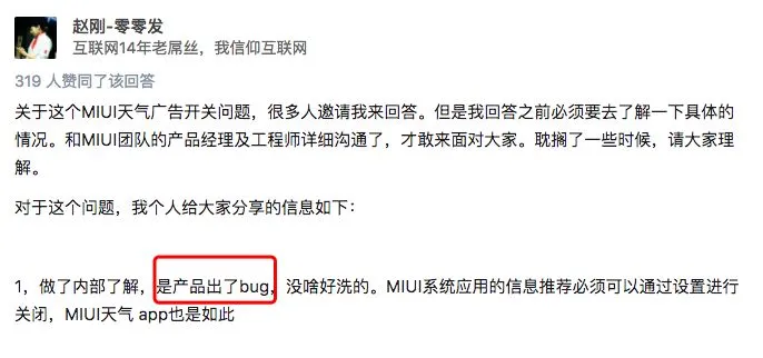 近日,MIUI 论坛里的一则帖子引起米粉和网友的热议,发帖者表示 MIUI 8.1.10 内测版中的天气应用中的广告开关消失。随后,有网友把情况反映到了知乎上,“如何评价 2018 年开始,MIUI 移除部分系统应用「广告关闭开关」的行为?”这个问题已经有 531 个回答,超过 80 万的人浏览。小米官方人员的回复为这是系统 Bug,将会马上修复。