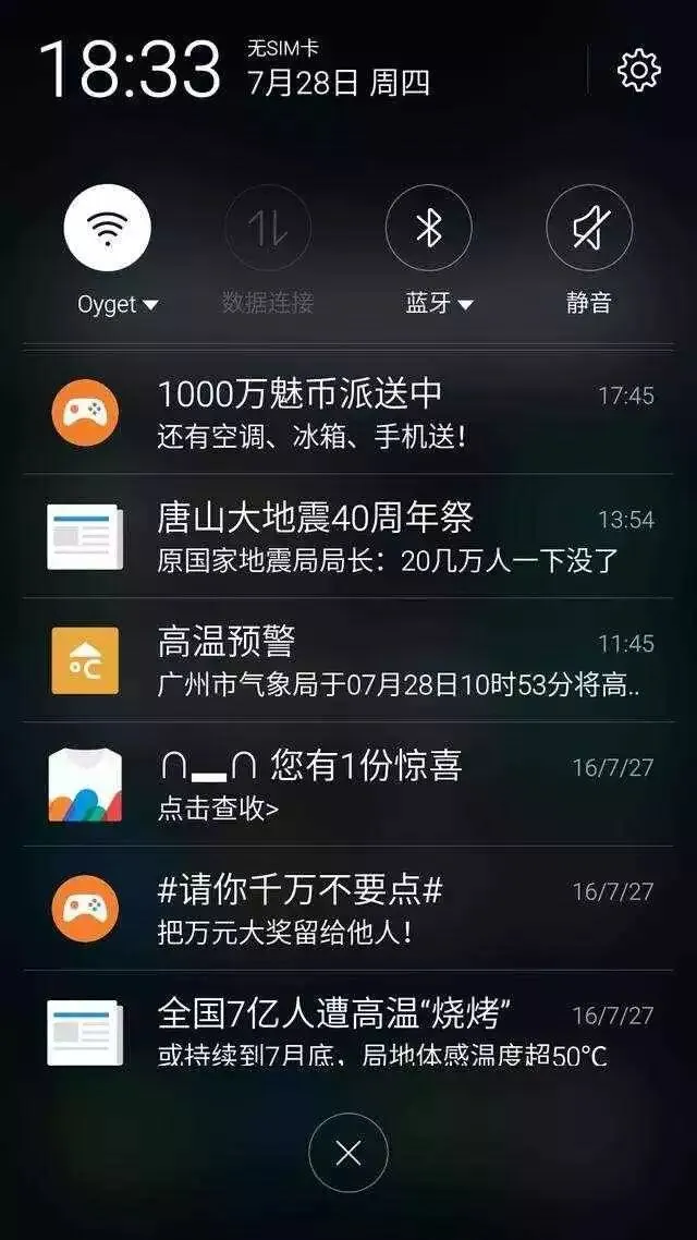 除了上面提到的嵌入式广告外,霸占通知栏的推送广告也让用户不胜其烦。曾几何时,推送功能还是智能手机系统厂商津津乐道的卖点,如今也被广告所利用。推送的广告和重要的消息混杂在一起,让人不堪其扰。
