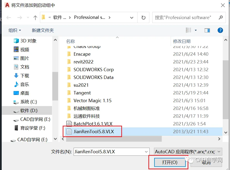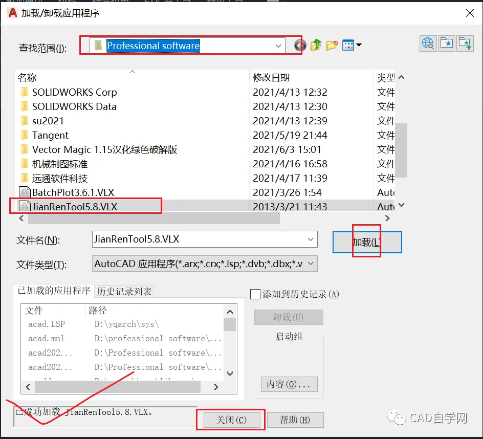 选择插件的位置,找到JianRenTool5.8.VLX,选中,点击加载,左下角提示已经成功加载,然后关闭;