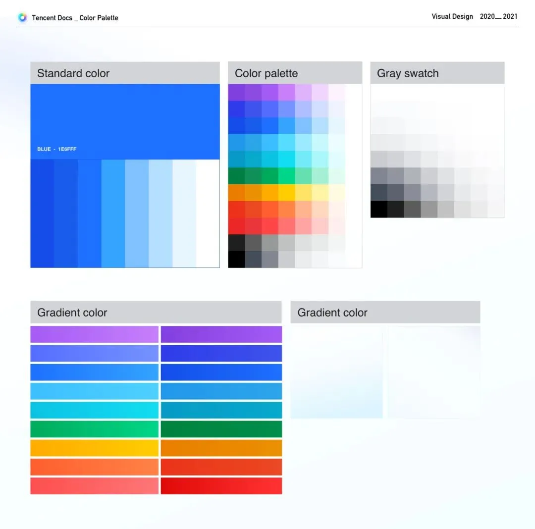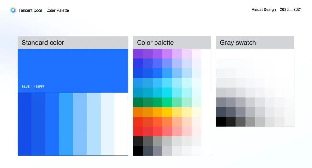 同时我们认为灰色在腾讯文档的色彩系统中起着至关重要的作用,为产品界面创造结构、表达边界、建立信息层次。我们将灰色赋予了统一的品牌认知感受,将蓝色加入到中性灰色里,生成了腾讯文档特有的蓝灰色。