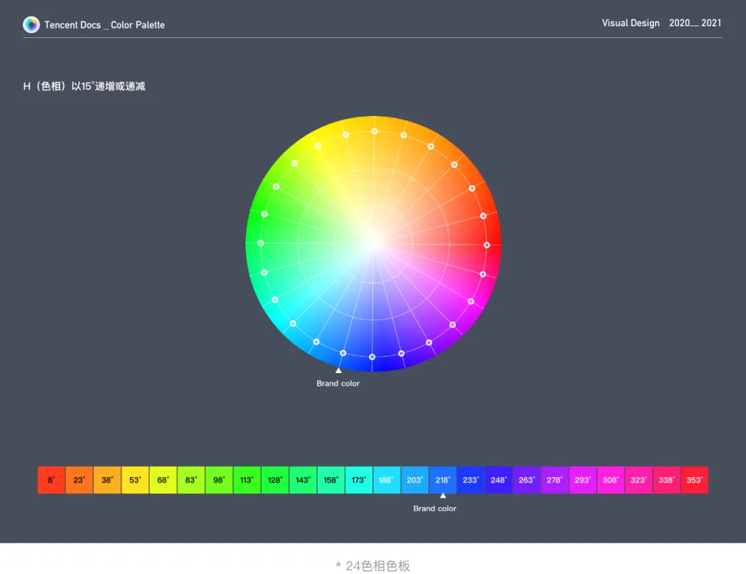 我们以腾讯文档标准色#1E6FFF(H 218 S 88 B 100) 为起始点,S(饱和度)、B(明度)保持不变,H(色相)以218°为起点,以15°为增量或减量标准,生成24色色板。这个色板是我们选取辅助色的重要依据。