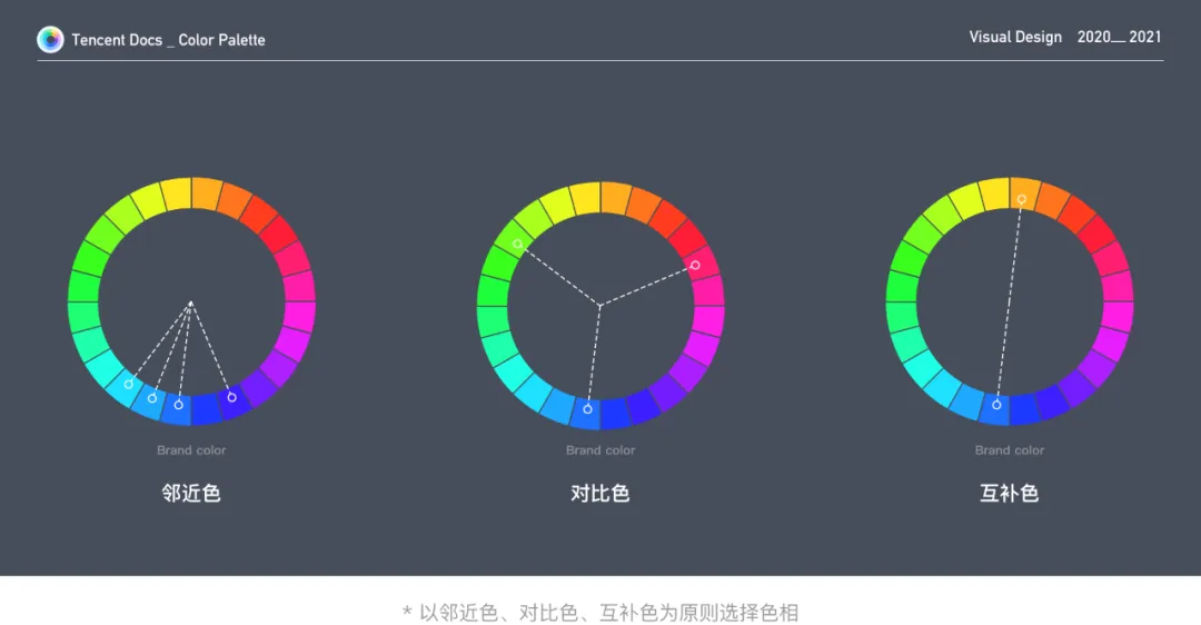 总的原则是利用邻近色构建有质感、品牌感的色彩家族,利用对比色及互补色扩展色相,以制造更强烈的色彩对比,满足一些冲突性场景。