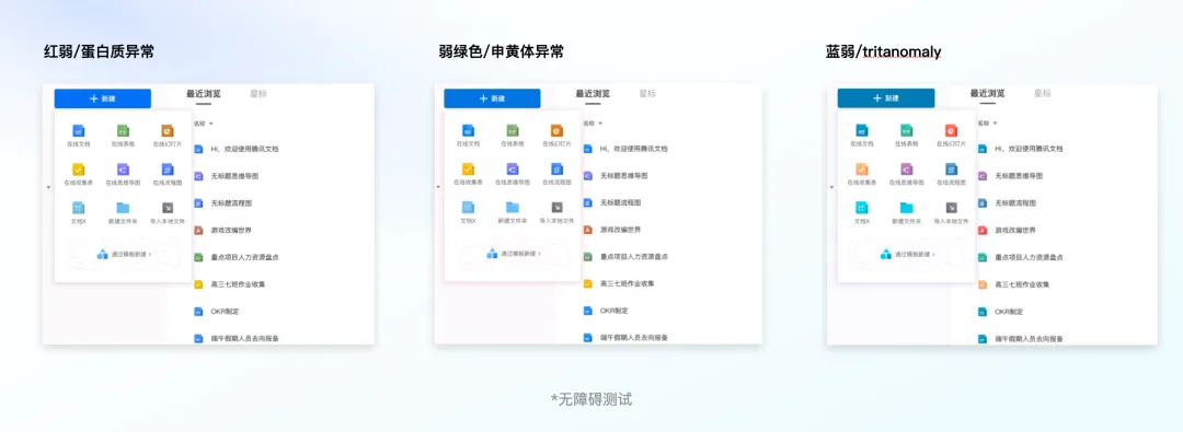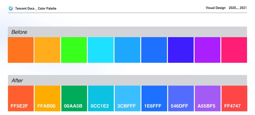 校正后我们得到了清澈明亮、清晰易分辨的腾讯文档的主色+辅助色。并且针对视障群体进行了色彩测试。