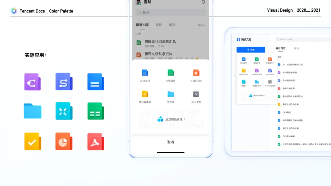 腾讯文档的产品生态愈来愈丰富多元。我们拥有多品类的产品,为用户提供了丰富的产品功能,其中云端协作、文档资产的沉淀管理是腾讯文档的非常重要的能力,在线文档、在线表格、在线幻灯片、在线收集表、在线思维导图、在线流程图以及文件夹等的品类图标,又是用户在对文档进行协作分享及沉淀时,识别不同类型文件的关键因素。基于此,腾讯文档相较于其他产品需要更多的辅助色。