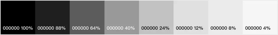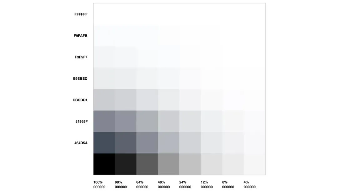 为构建一个高效易用的灰色调色板,我们将蓝灰色彩作为Y轴,有透明度的中性灰色作为X轴,两者透明度保持一致,建立起腾讯文档有梯度的、丰富的灰色调色板。