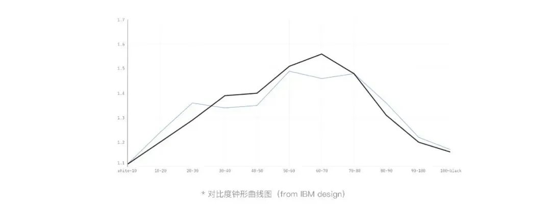 对比度是否合理是阅读体验是否舒适的重要评价维度,过高或者过低的对比度都会影响阅读体验及识别度。下图是对比度的钟型曲线图,随着对比度的增加,舒适度和识别度都在上升,但一旦超过一个界点,对比度越增加,识别度和友好度亦会逐步下降。