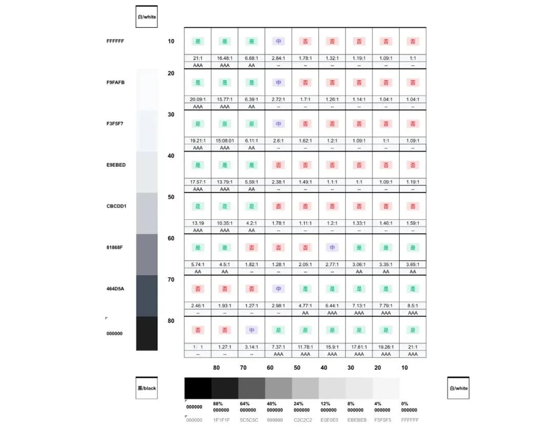 为保证视障用户的使用,保证足够的对比度,遵守 WCAG 2.0 的标准,我们对调色板灰色的对比度进行了可用性测试,以指导腾讯文档体验设计中灰色调色板的使用。