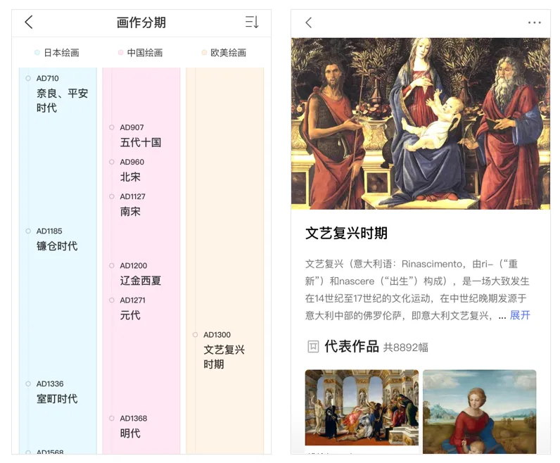 全历史按照流派、材质、题材等对名人名画进行了分类。