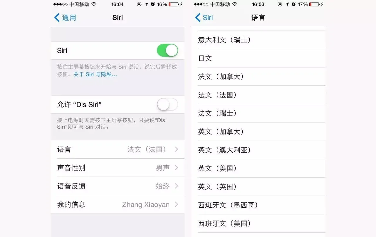 2. 设置方法:设置——通用——Siri——语言——法语(还可以选择男声或女声哦!)