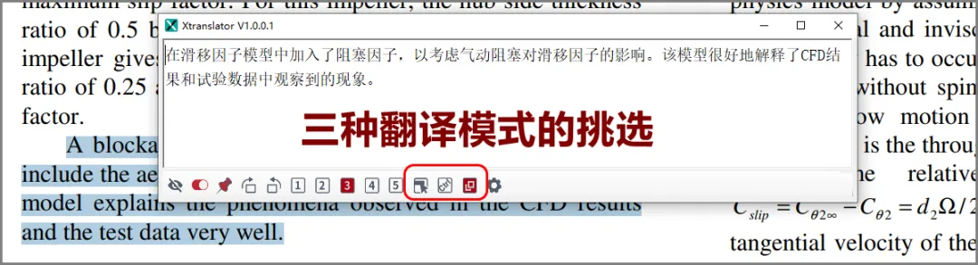 下图中三个箭头所指即为三个翻译模式按钮。红色代表选中状态。软件默认是“复制翻译模式”,也就是说选中一段话,按Ctrl键+C