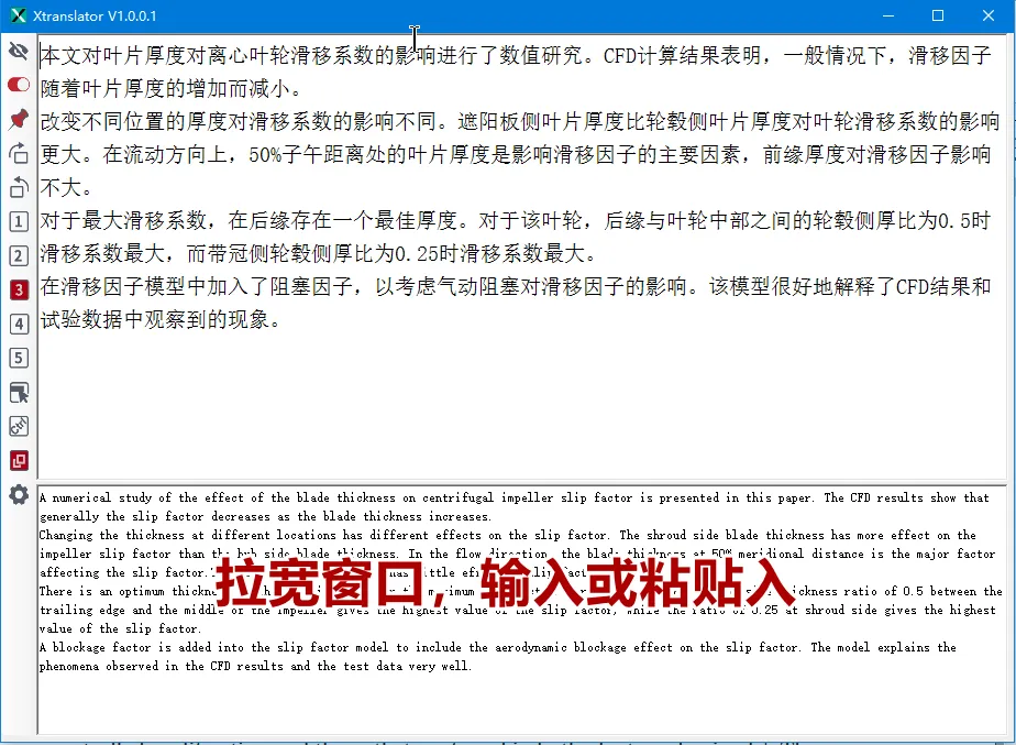 原文区域可拖出展示。修改原文,会立即更新翻译。右侧右键可快速复制原文或译文。将窗口拉大,可作为输入翻译模式使用。