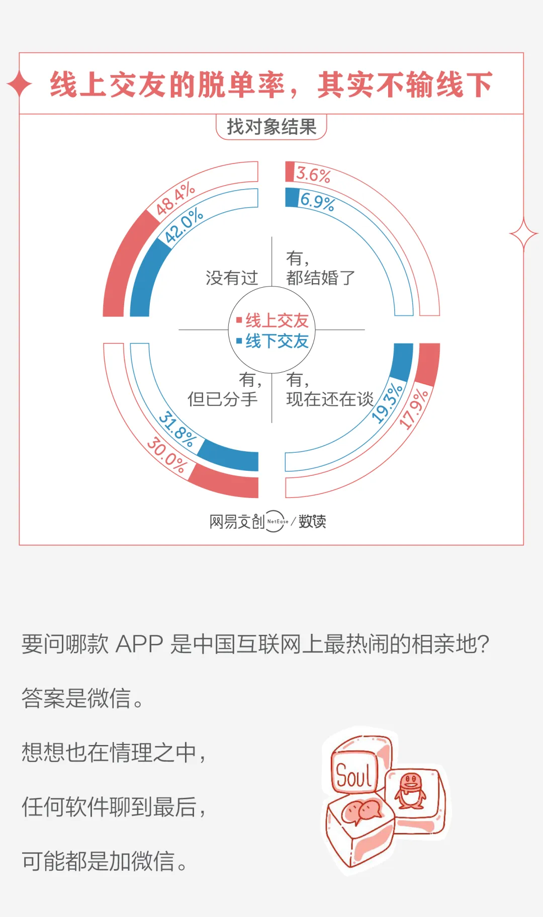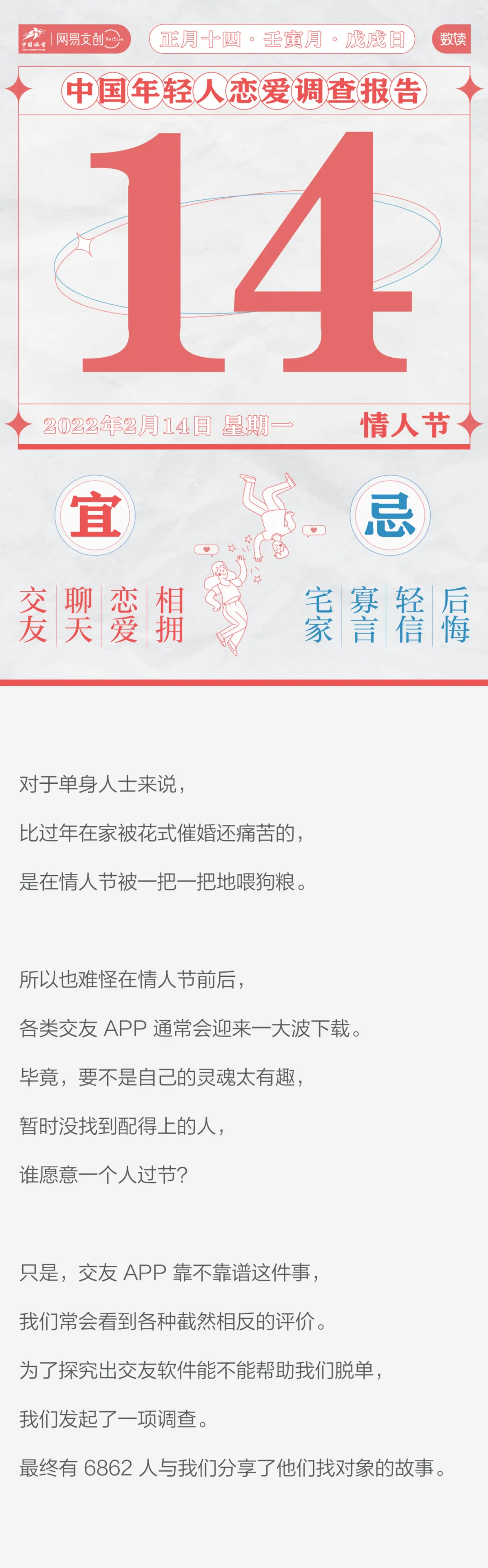 但对于很多人来说,线上交友都是不可或缺的社交途径,而且此处“社交”不仅限于找对象。不能在软件上找到共度情人节的人,哪怕能找到共同吐槽情人节的人也不赖。