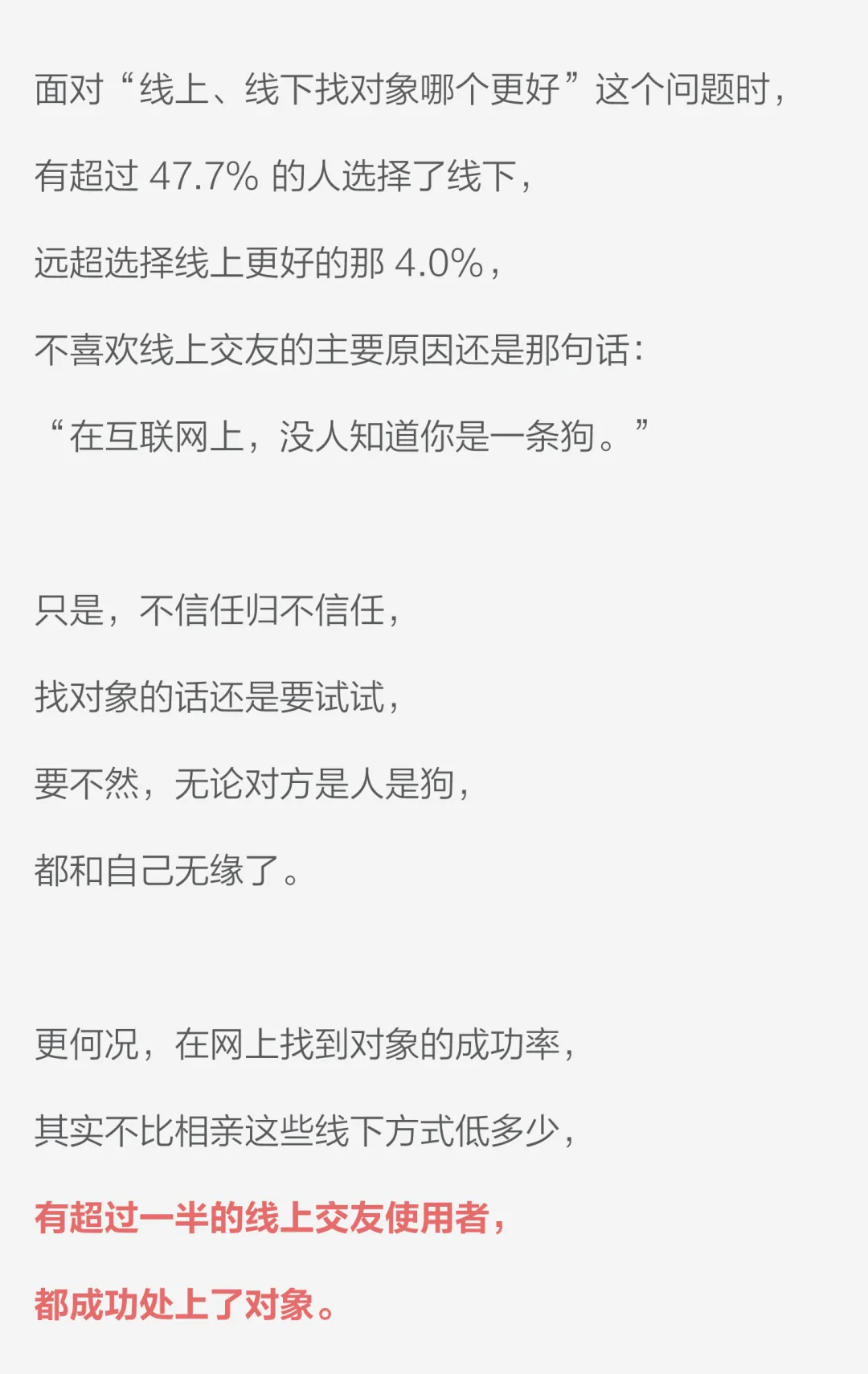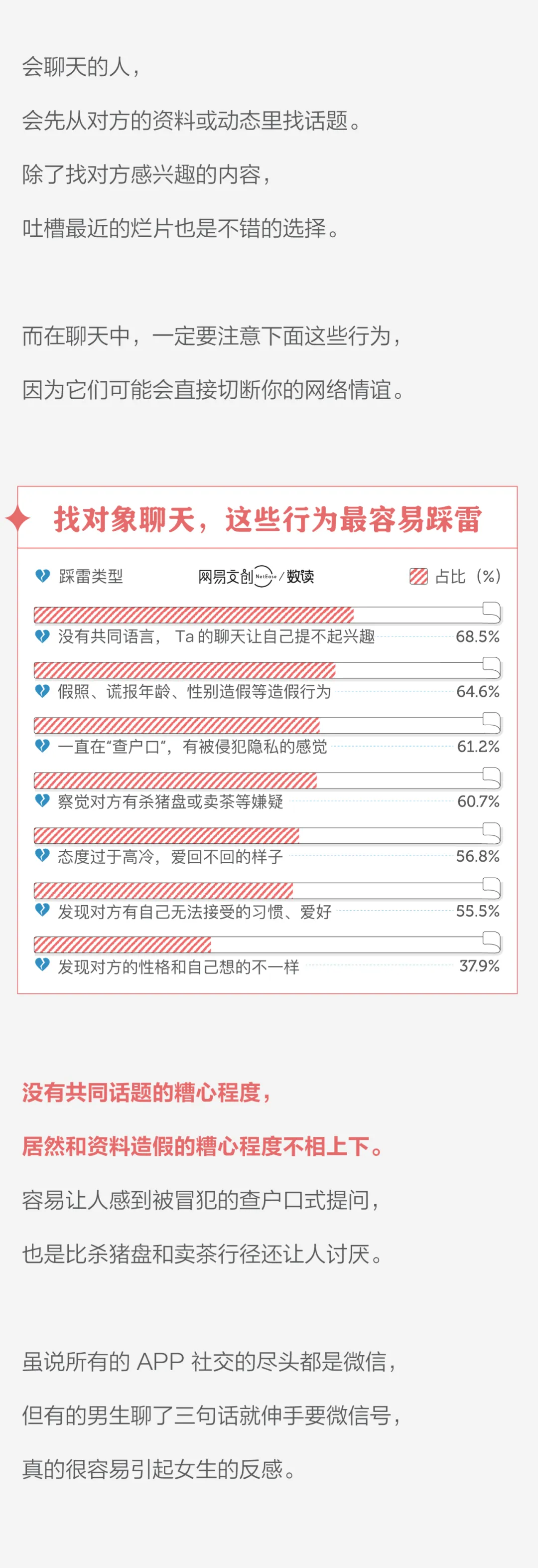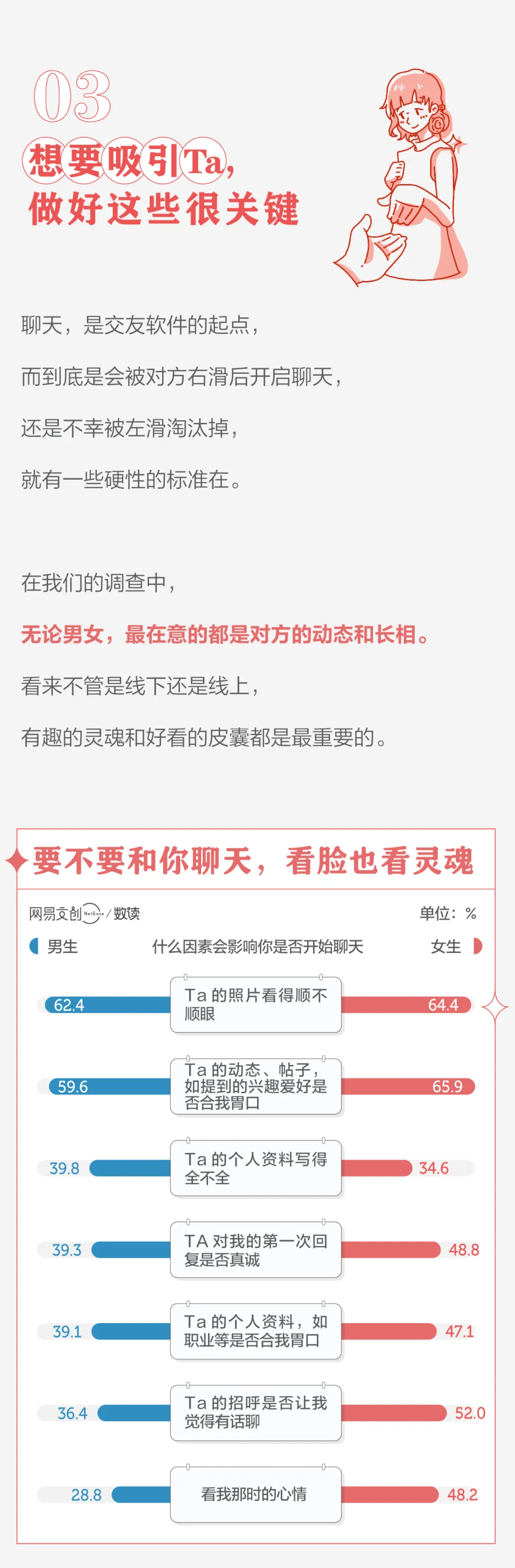 10、不管是线上还是线下找对象,八成的受访者认为最重要的是“让人舒服的聊天”。