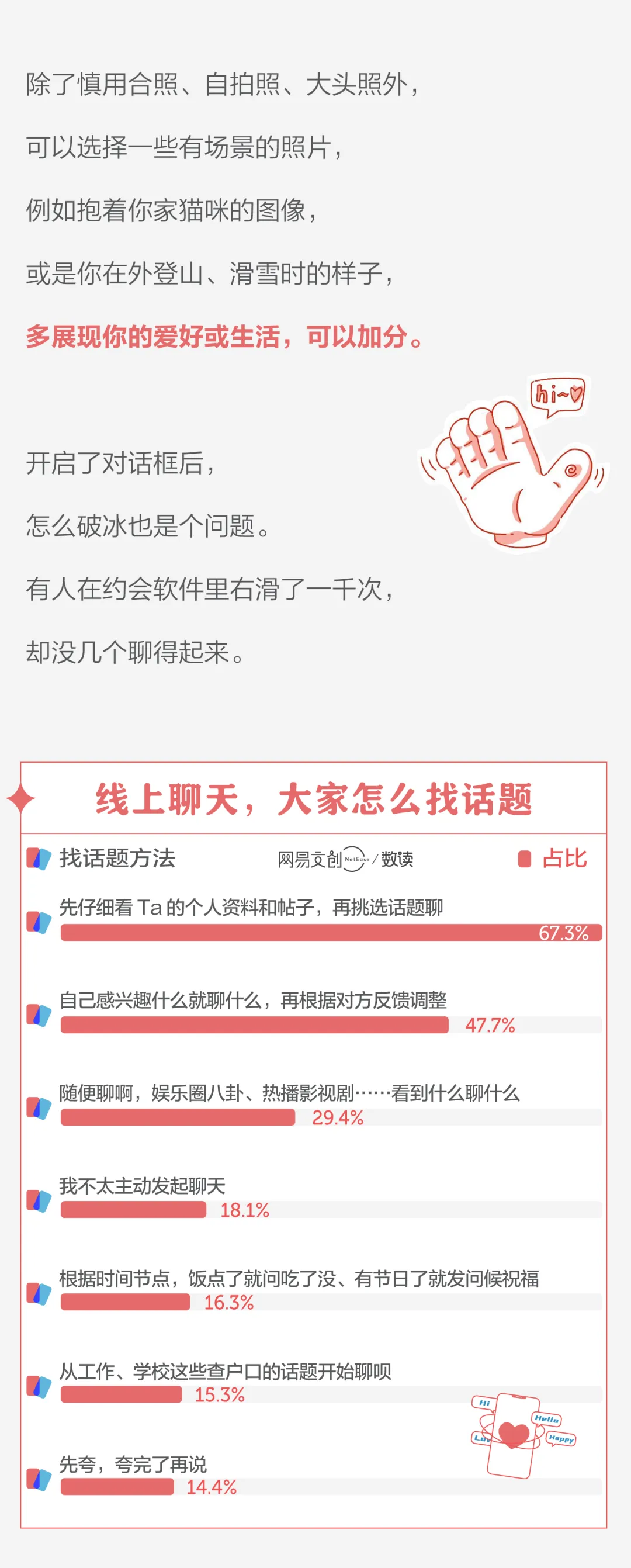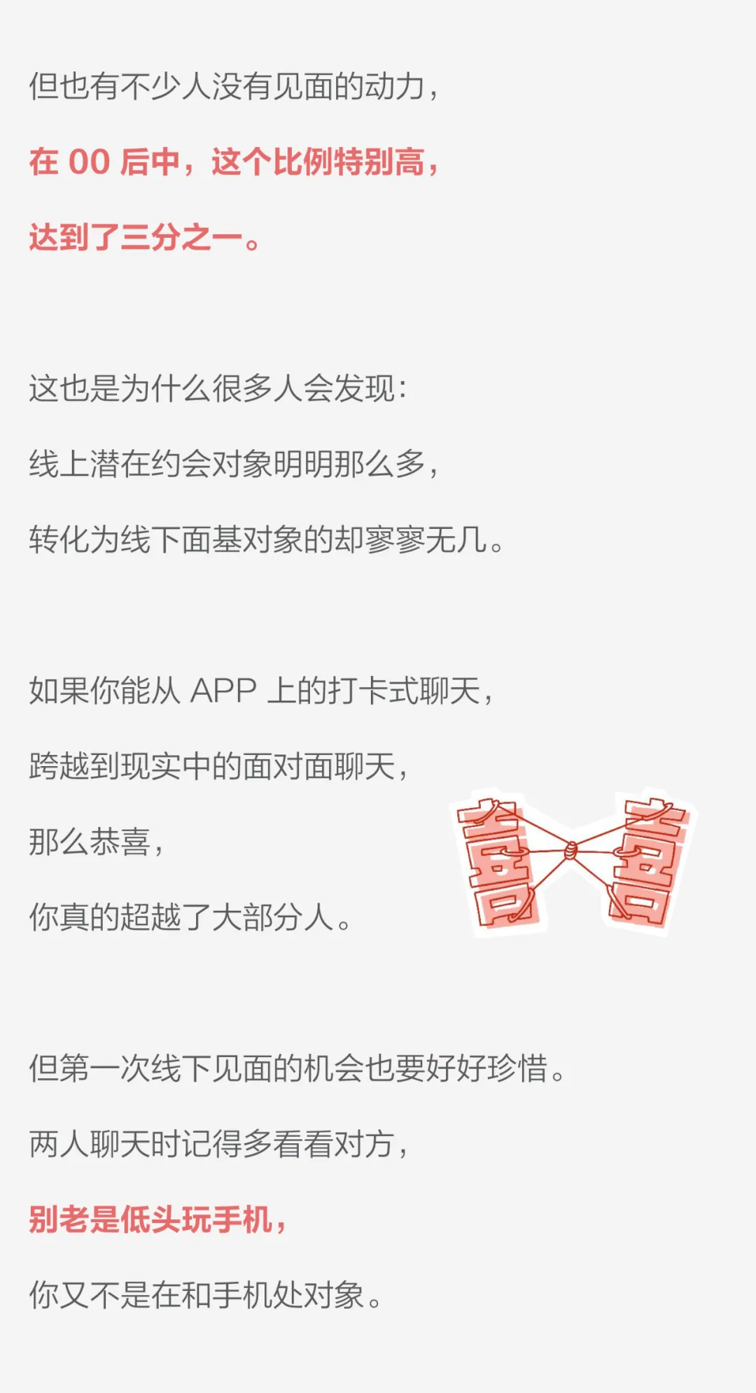 重要的是,我们使用社交软件的时候,做最真实的自己!展示自己漂亮帅气、优雅可爱、自信有特色的外表,但不要照骗;别遮掩风趣认真、善良渊博的内在,同时也别“查户口”式聊天。等到线下面基的那天,也要好好打扮、认真地与对方交流。