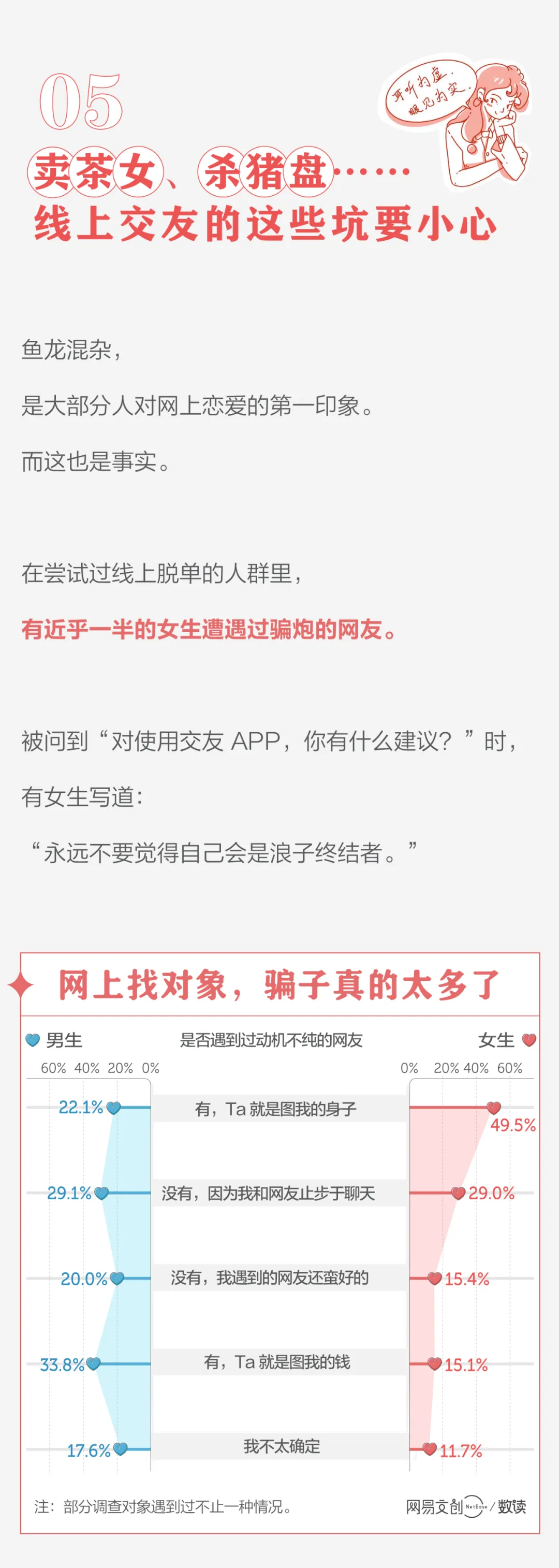 7、近一半使用过线上交友的女性遇到过图色的网友,超过三成的男性遇到过图钱的网友。