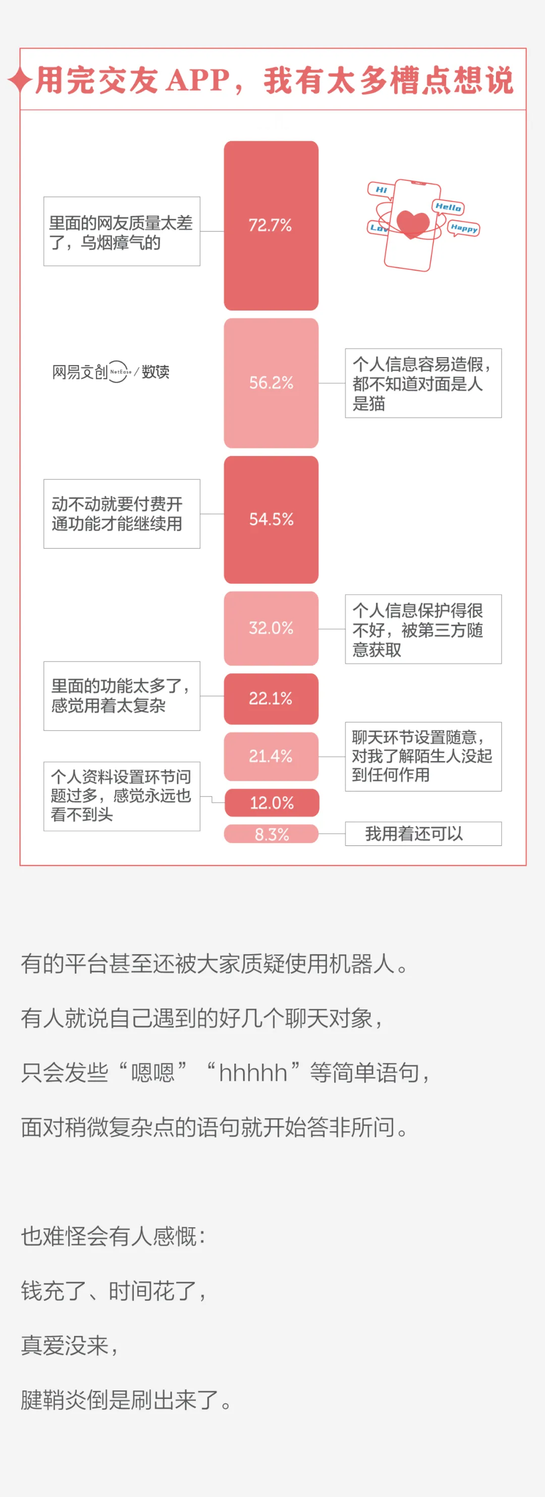 8、超七成的受访者会因网友质量太差而抛弃一款交友 APP。