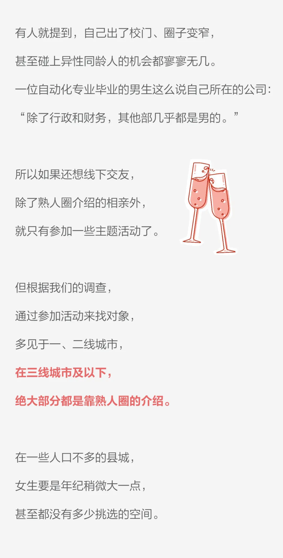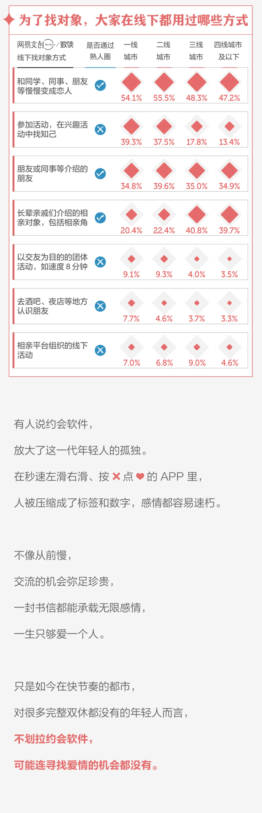 “社交圈窄”终是许多人无法脱单的缘由。各位,打开思路,还有不少人在周围的朋友、朋友的朋友、朋友的朋友的同事里面翻出了对象呢。