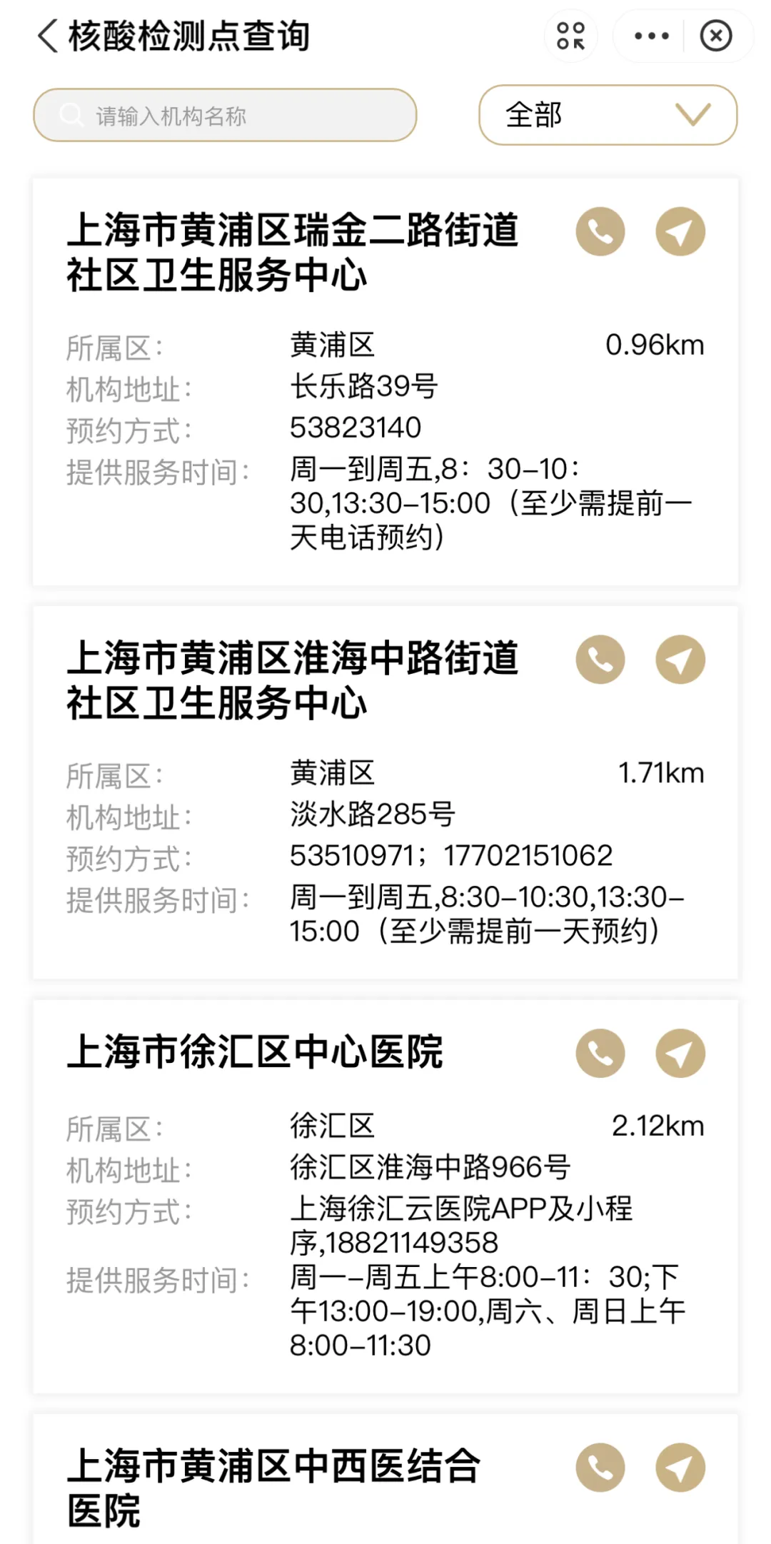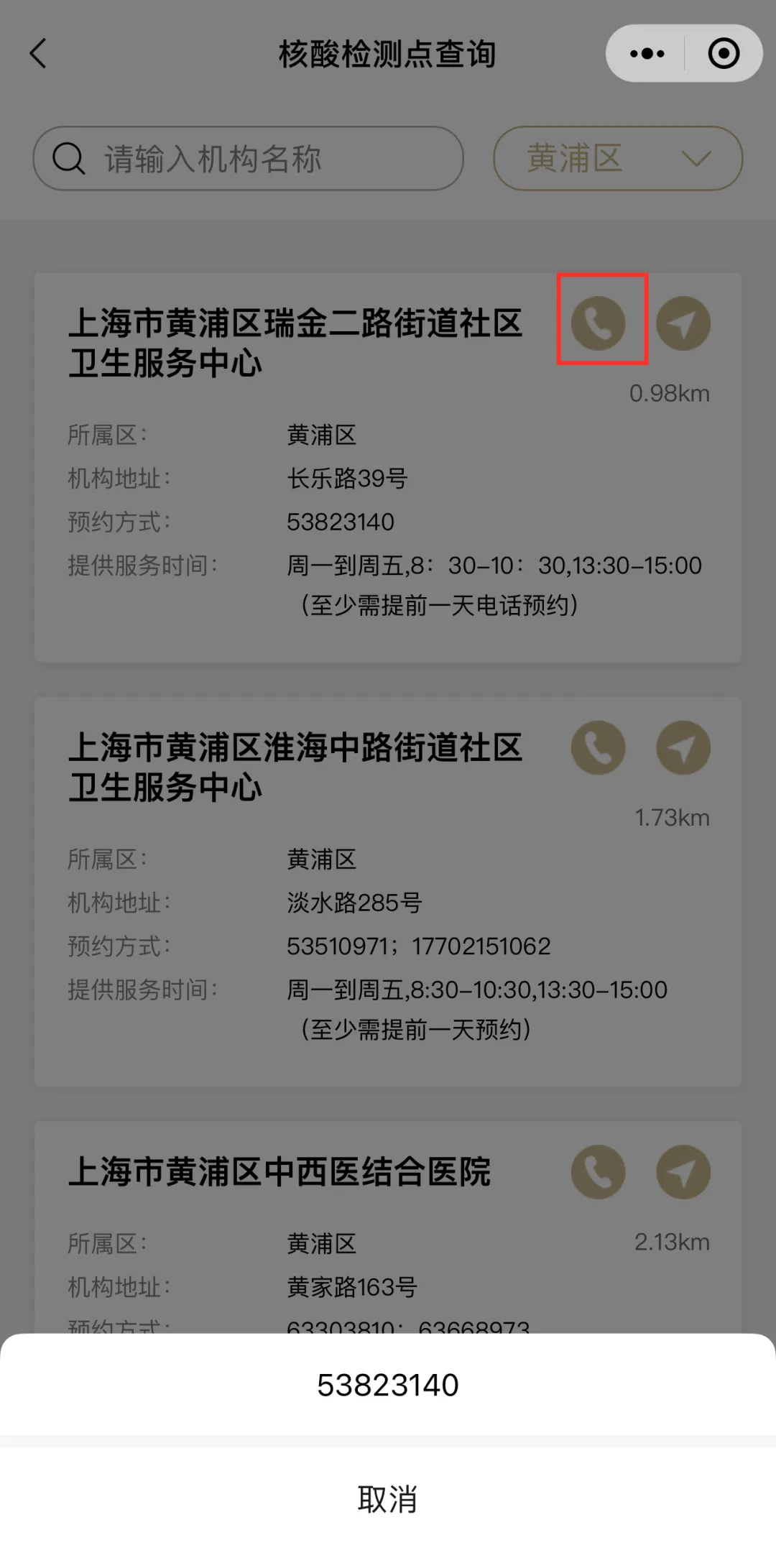 ④在相应的工作时间内,点击所选检测点的“小电话”按钮可直接电话进行核酸检测预约