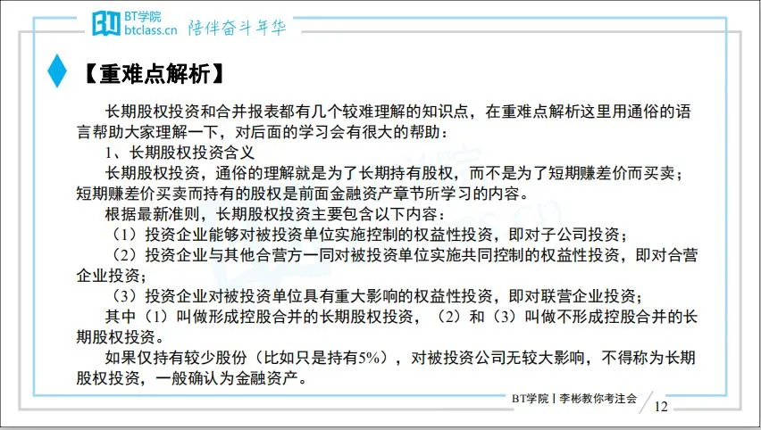 这份讲义将会计的所有知识点融会贯通转换为通俗易懂的口语,特别是长投合并,之前了解过BT学院CPA课程的同学就知道,这一章堪称经典,把长投和合并完美融合。
