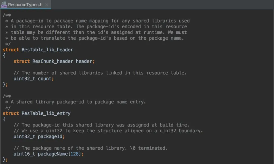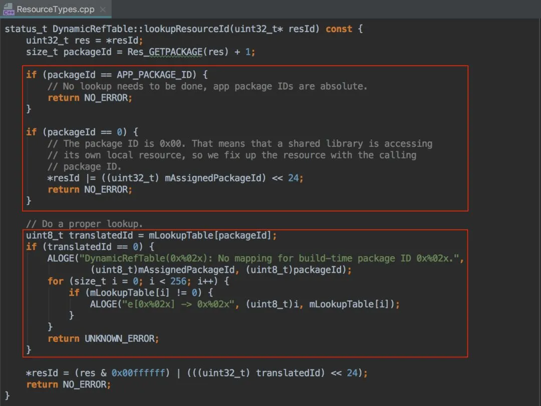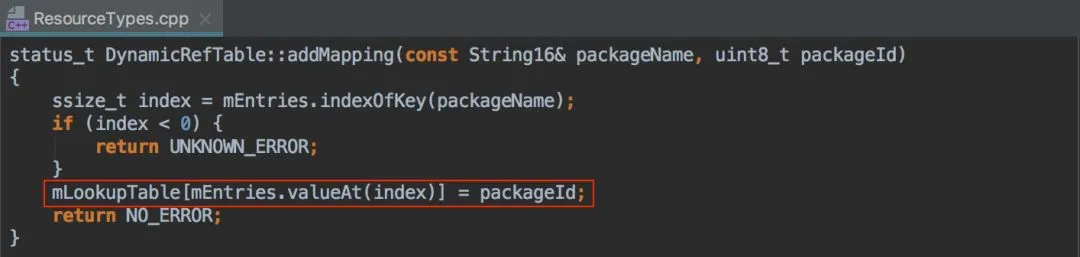 在 addMapping 中,我们会把 Library Chunk 中的 packageId 在 mLookupTable 数组中进行注册(就是简单的赋值),注册之后我们自定义的 Package ID 才会被系统认可,从而确保含有 Parent 资源的正常解析。