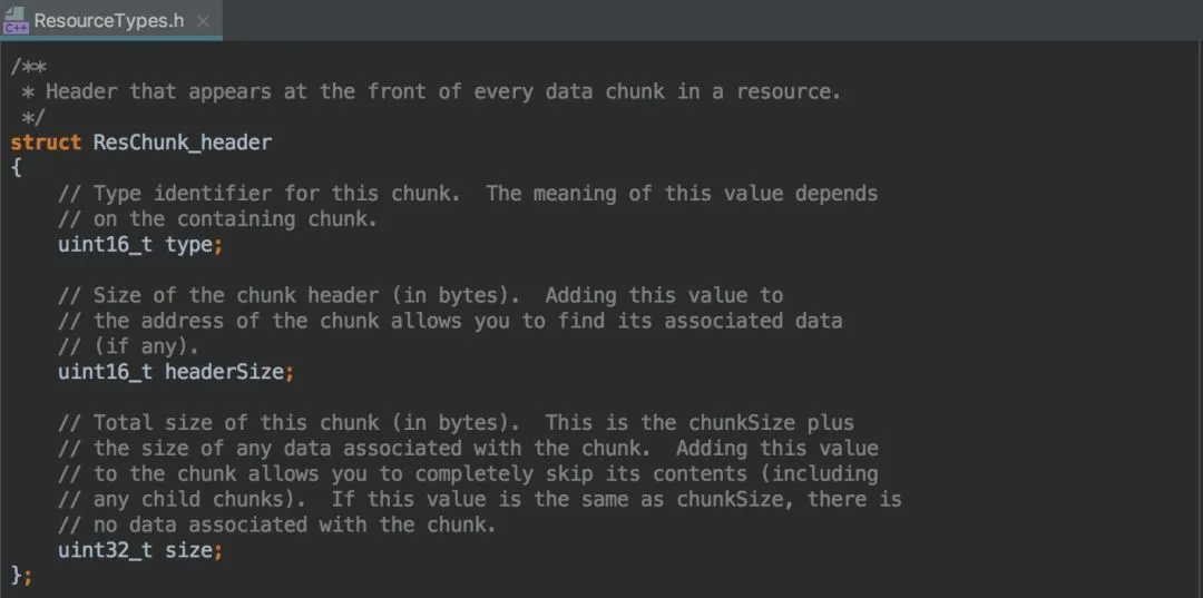 资源信息:每段 ResChunk 的内容都以 8 字节的 ResChunk_header 开头,用于描述 ResChunk 的类型 + 长度,如下图: