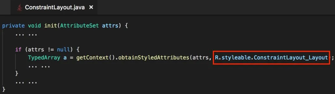 那么在 App 运行的过程中,ConstraintLayout 会通过 android.support.constraint.R.class 获取解析自定义属性,如下图:
