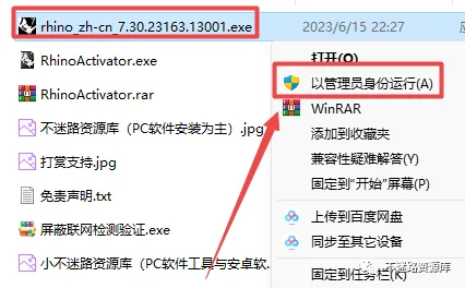2.打开刚刚解压的文件夹,鼠标右键点击“rhino_zh-cn_7.30.23163.13001.exe”选择“以管理员身份运行”
