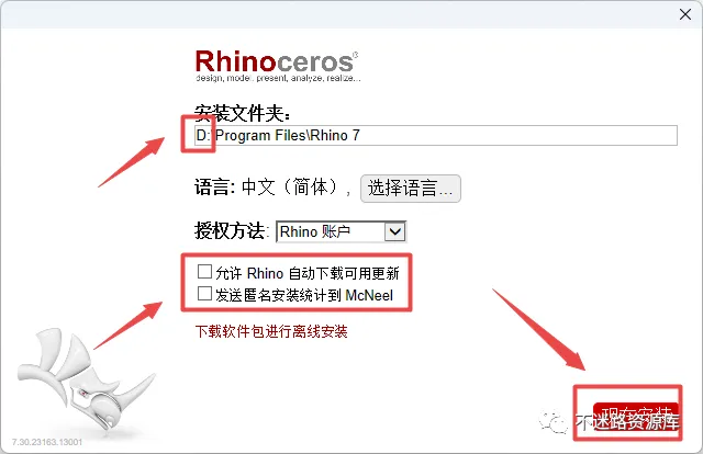 4.选择软件安装路径,建议和教程中的保持一致,本例安装到D盘(将路径地址中的首字符C改为D表示安装到D盘,安装路径不要出现中文),取消勾选“允许Rhino自动下载可用更新”和“发送匿名安装统计…”,然后点击“现在安装”