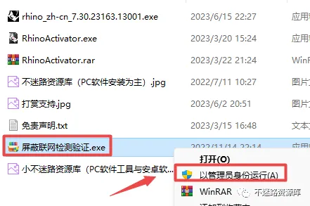 7.返回之前解压的“Rhino V7.30”文件夹,鼠标右键点击“屏蔽联网检测验证.exe”选择“以管理员身份运行”