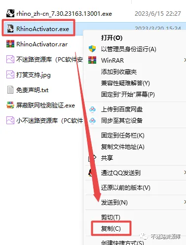 9.选中“RhinoActivator.exe”文件,鼠标右键选择“复制”