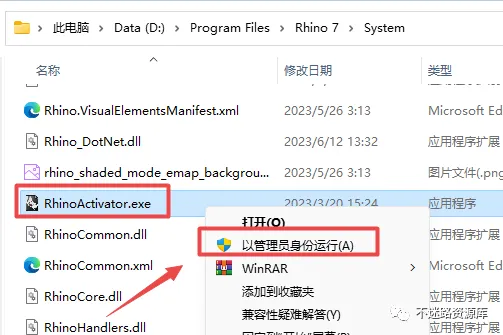 12.找到并选中复制过来的”RhinoActivator.exe“文件,鼠标右键点击“以管理员身份运行”