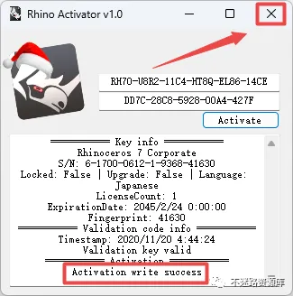 14.出现”Activation write success“这个提示表示破解成功,点击右上角的“X”关闭