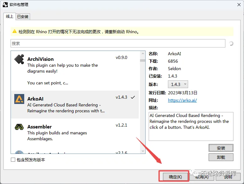 17.往下滑动,找到并选中“ArkoAI”,点击“安装”,点击“安装”,等待安装完成