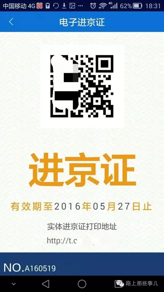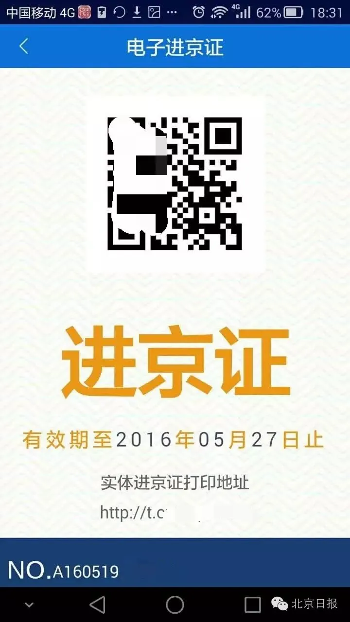 点击“查看电子进京证”的链接,屏幕上跳出三个黄色大字“进京证”和一个二维码,同时标注了“实体进京证打印地址”。